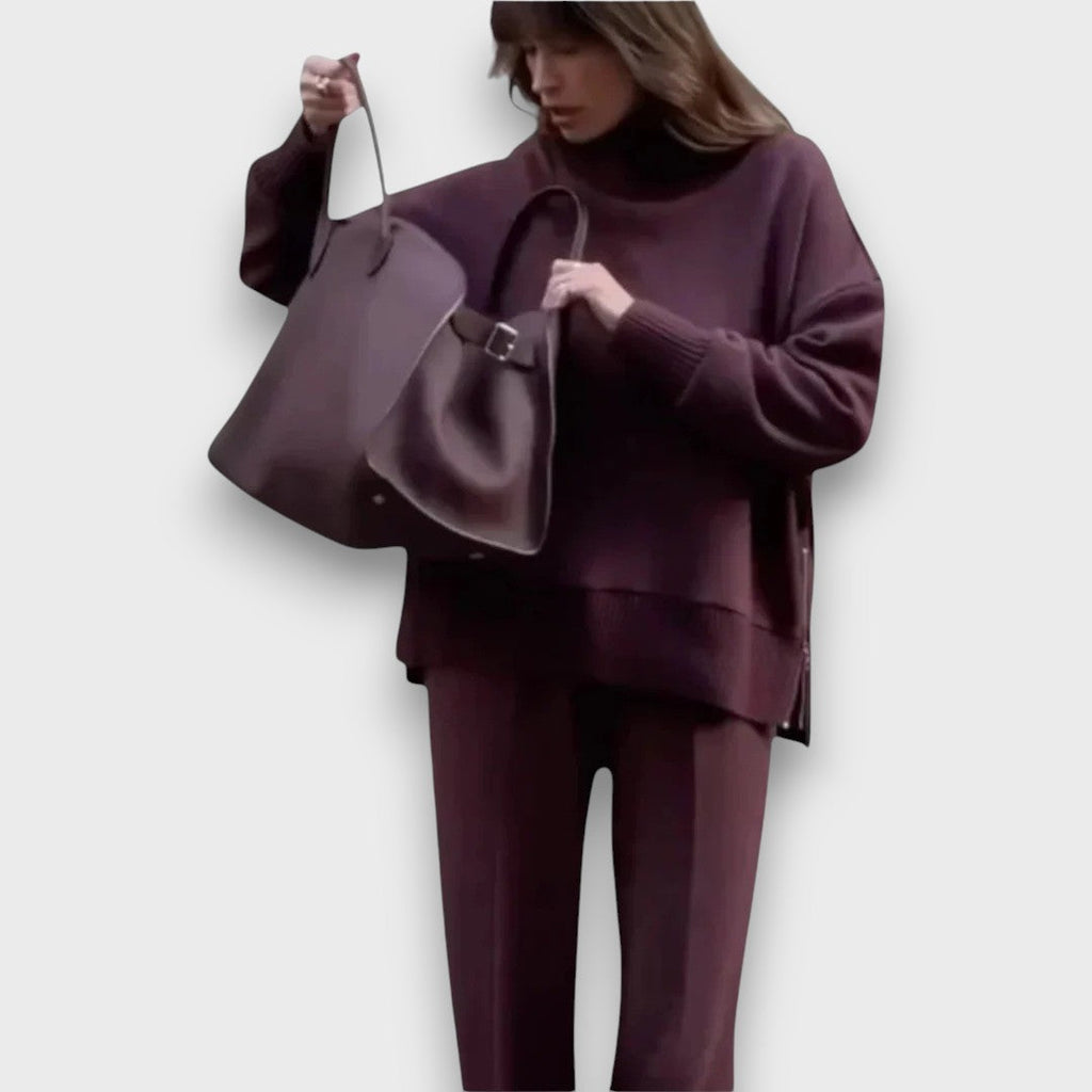 Cynora combines effortless elegance with relaxed serenity. The soft top with a turtleneck provides a calm warmth, while the loosely cut pants offer freedom of movement and lightness. Together, they create an ensemble that carries comfort and style in perfect harmony. A two-piece set that enriches everyday life, travel, and quiet moments alike.