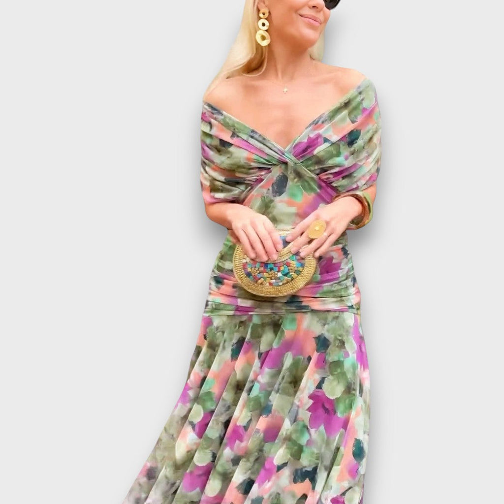 Fianna flows like a watercolor over the skin – with gentle colors that blend into one another and a sophisticated cut that gracefully frames the shoulders, waist, and movement. The crossed off-shoulder neckline brings sensual elegance, while the softly falling skirt adds a dancer's lightness to every movement.