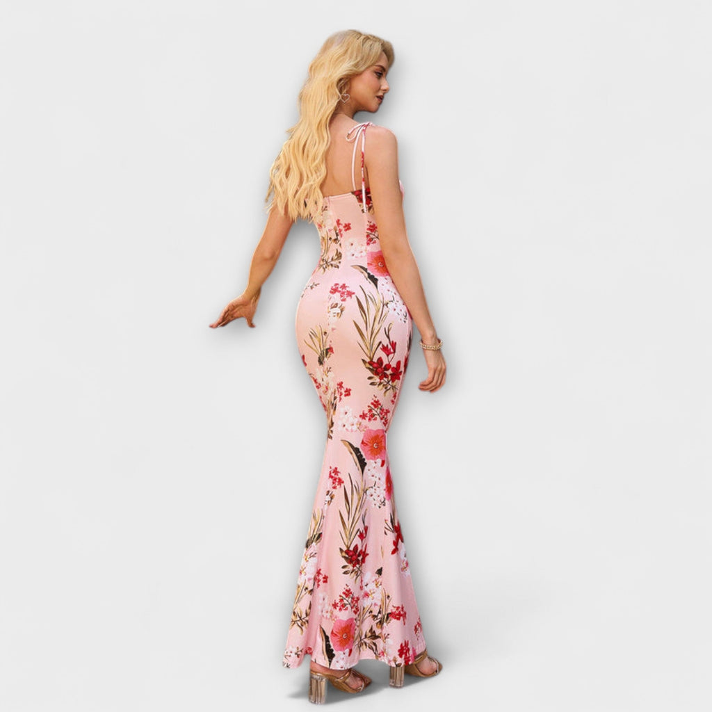 Step out confidently in this stunning maxi dress, featuring a beautiful all-over floral pattern that draws attention. The backless design and spaghetti straps create a chic silhouette, while the ruched bust area adds a hint of sophistication.