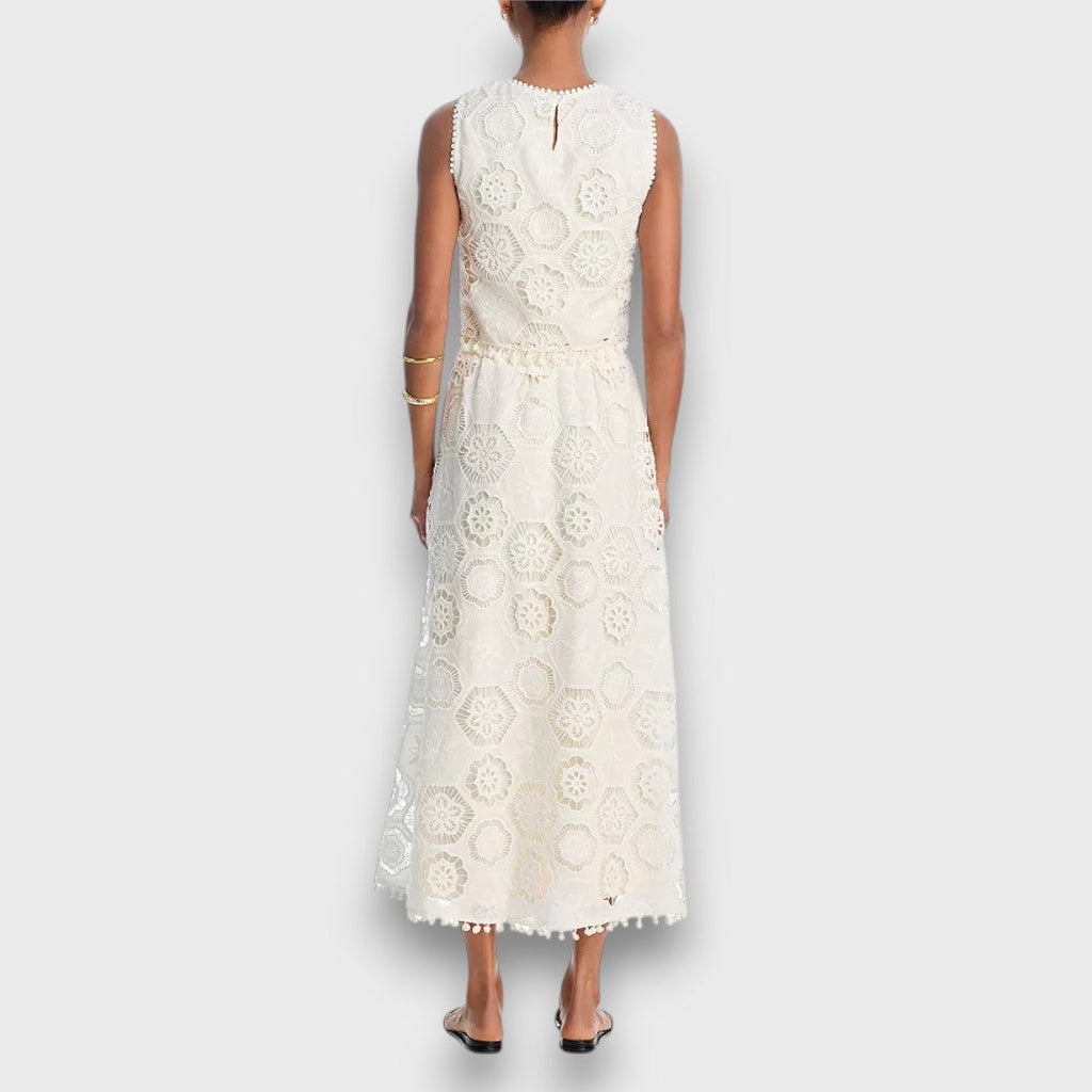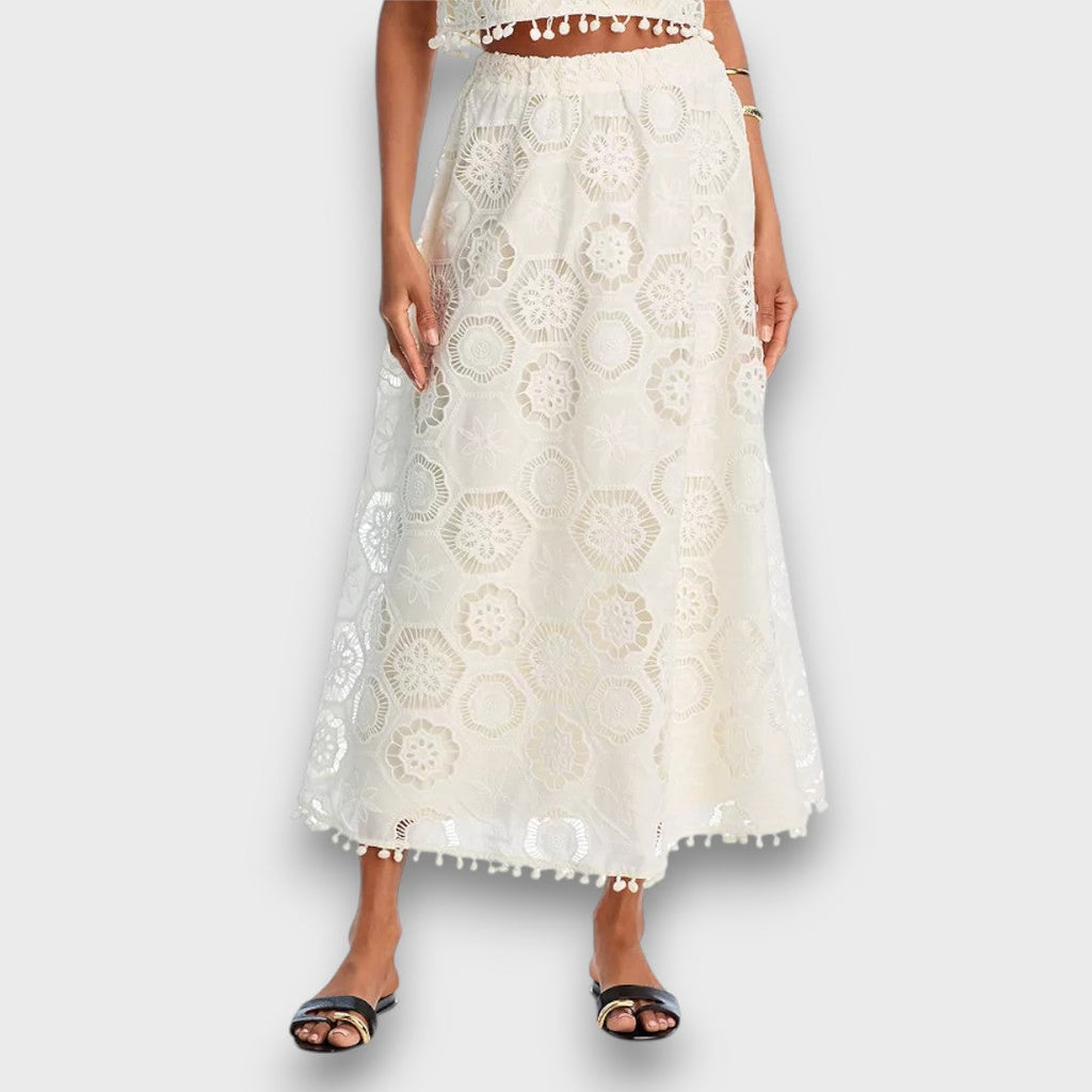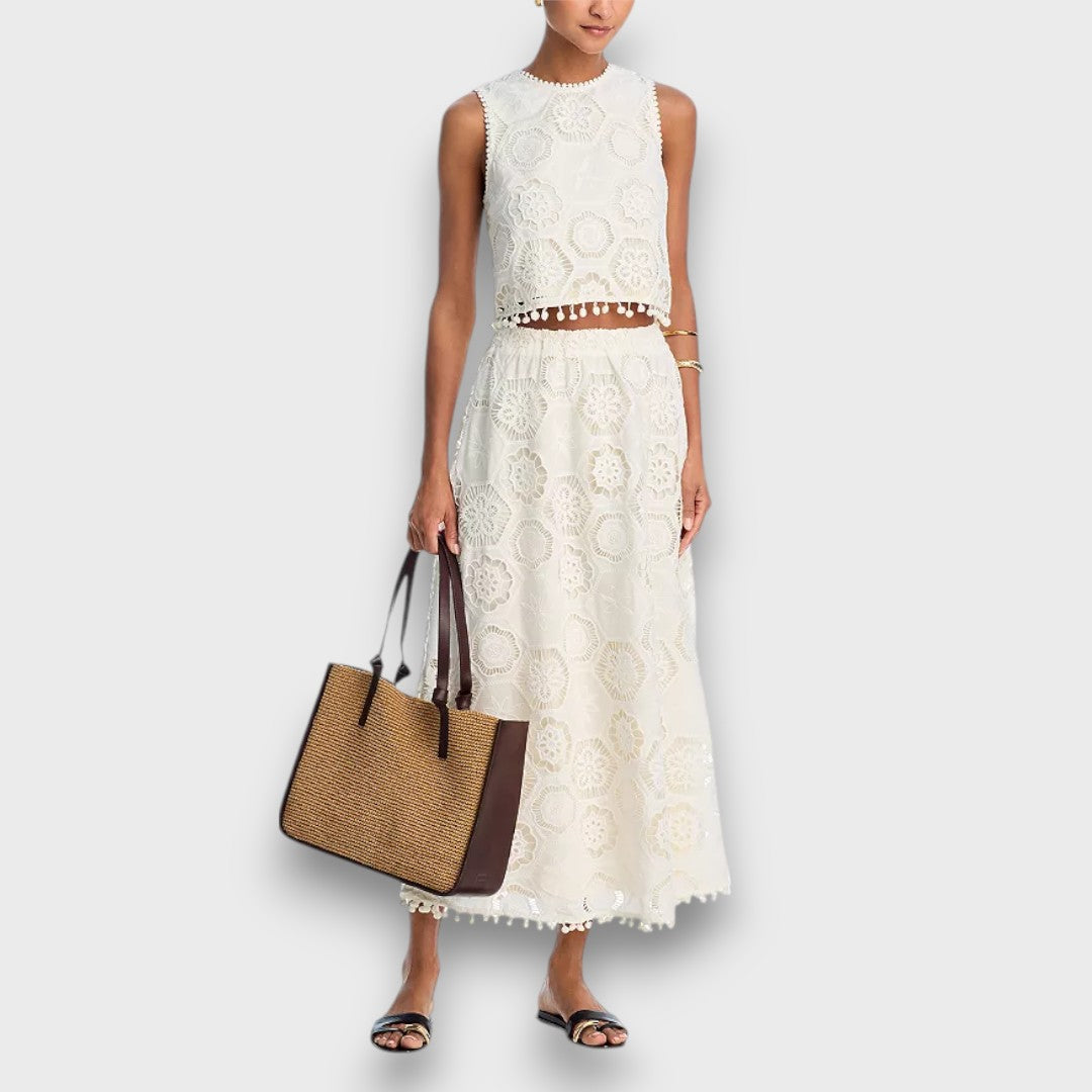 Zahara is the epitome of summer lightness – a two-piece ensemble made of delicate crochet lace that captures sunlight and sways with every step. The sleeveless crop top gently highlights the shoulders, while the midi skirt, adorned with playful pom-poms, accompanies every movement. Elegant, airy, timeless – perfect for days at the beach, strolls through the city, or Mediterranean evenings by candlelight.
