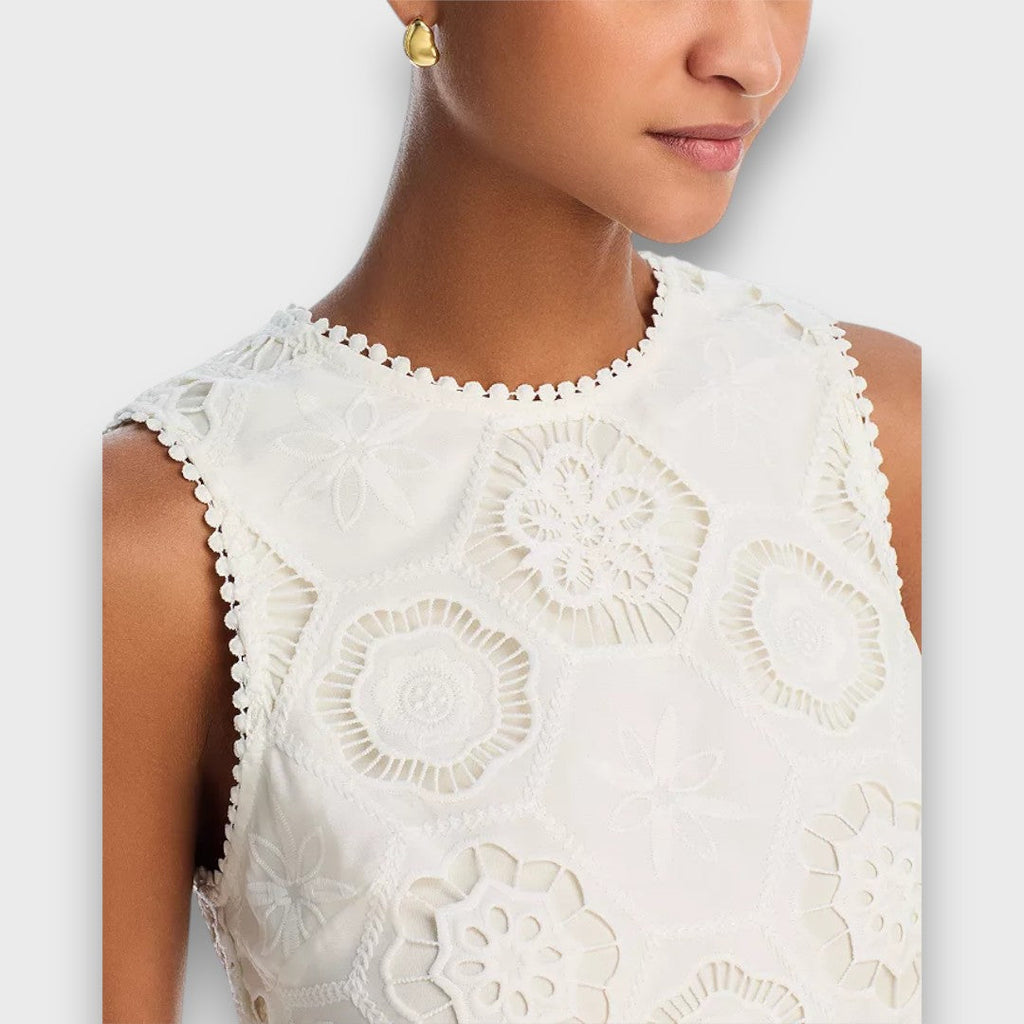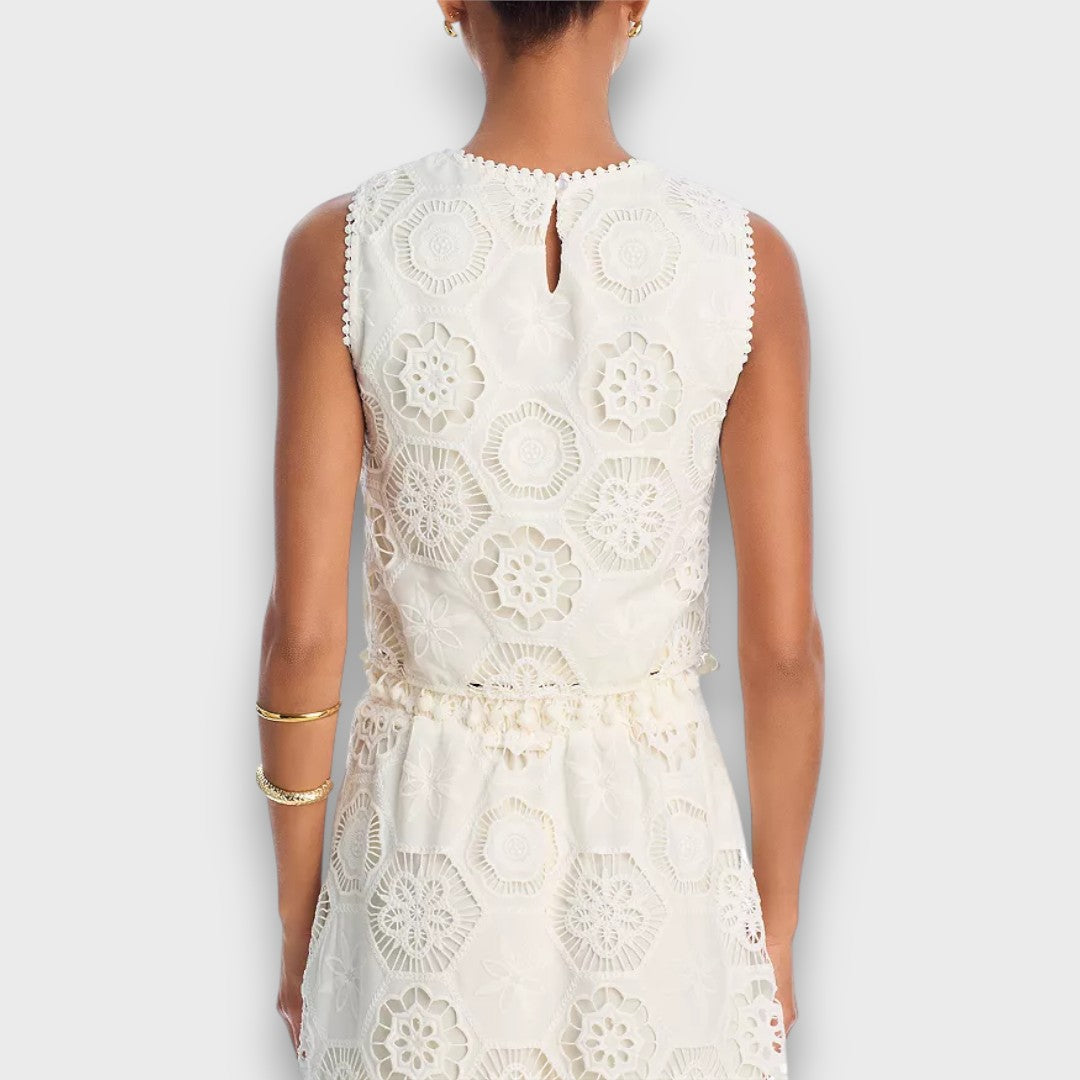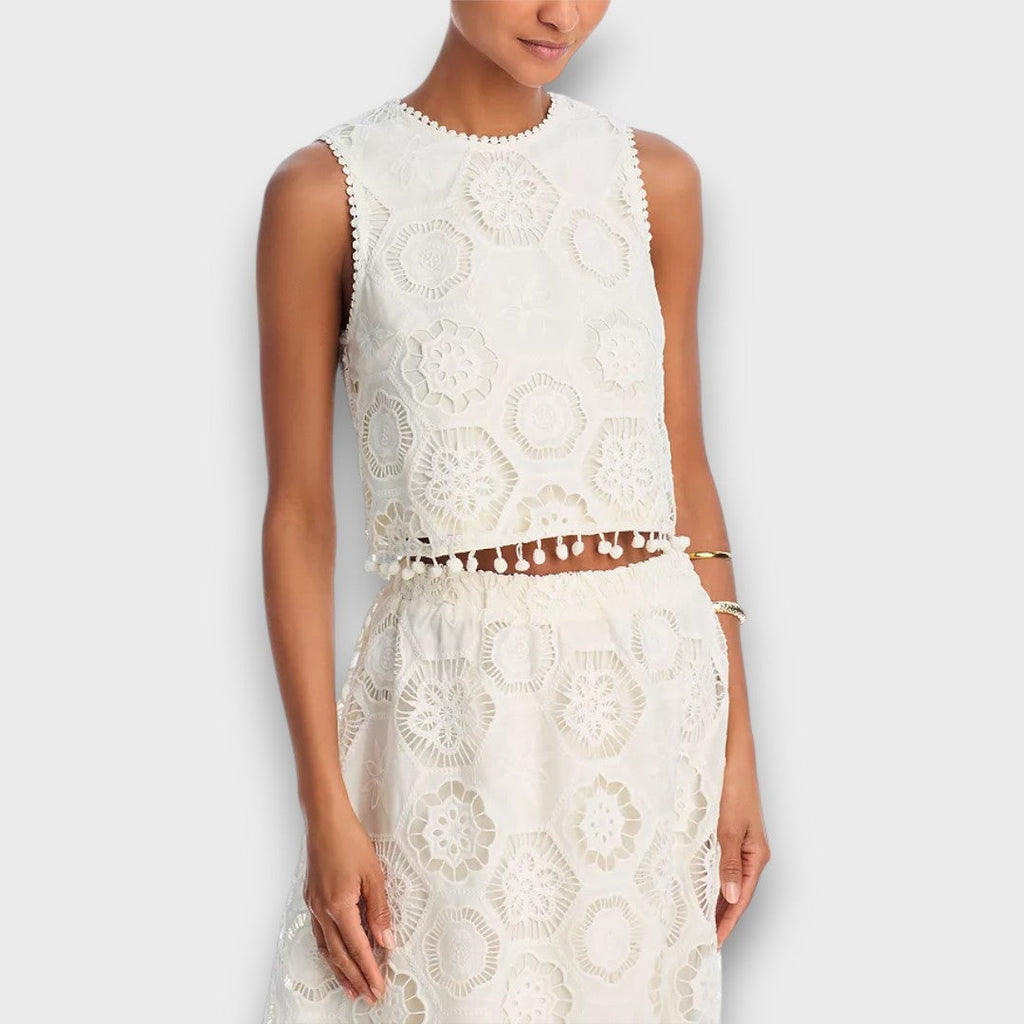 Zahara is the epitome of summer lightness – a two-piece ensemble made of delicate crochet lace that captures sunlight and sways with every step. The sleeveless crop top gently highlights the shoulders, while the midi skirt, adorned with playful pom-poms, accompanies every movement. Elegant, airy, timeless – perfect for days at the beach, strolls through the city, or Mediterranean evenings by candlelight.