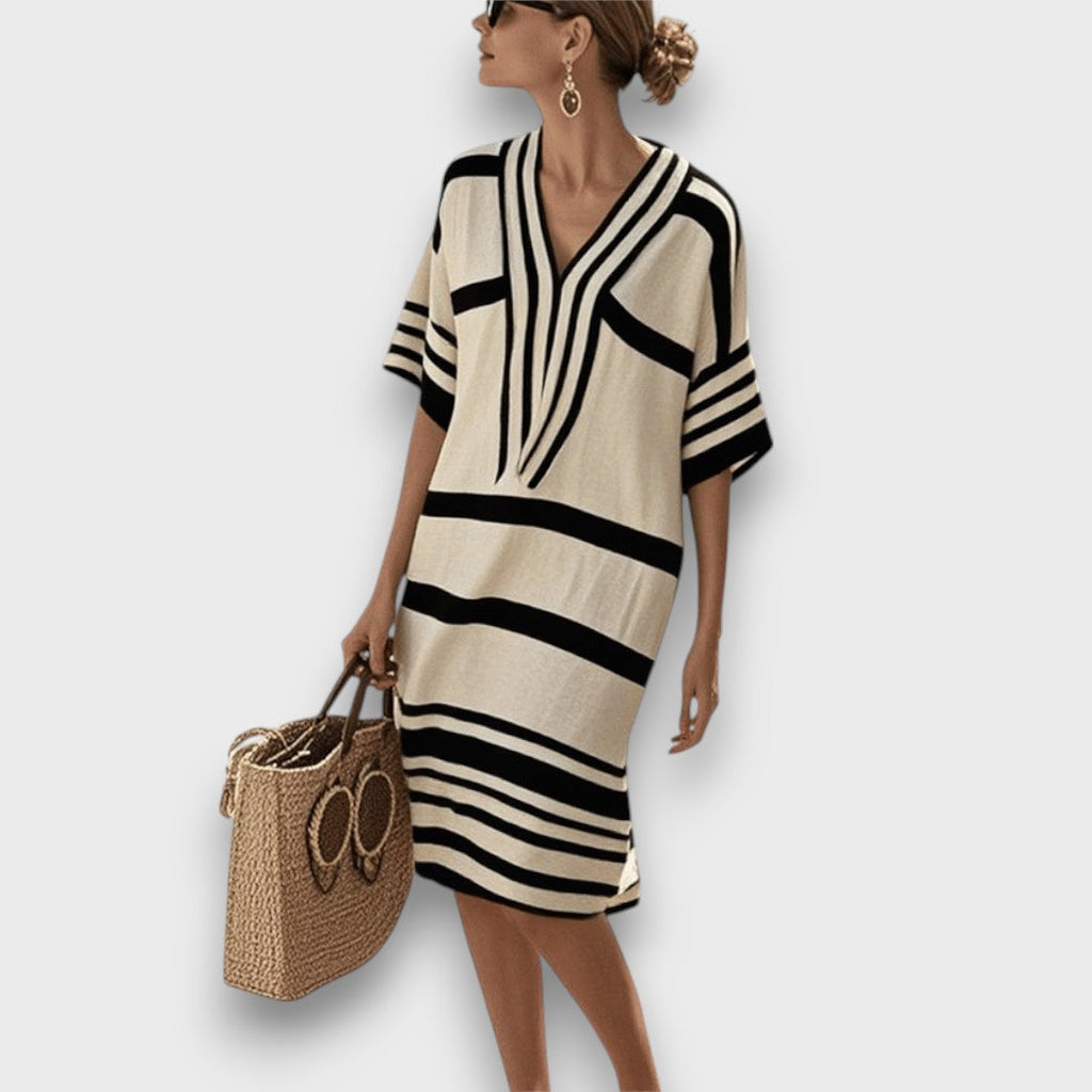 Calys embodies the lightness of the South – with a flowing cut, deep V-neckline, and contrasting stripes in warm natural tones. This dress is made for relaxed summer days, barefoot in the sand or with espadrilles at the market.
