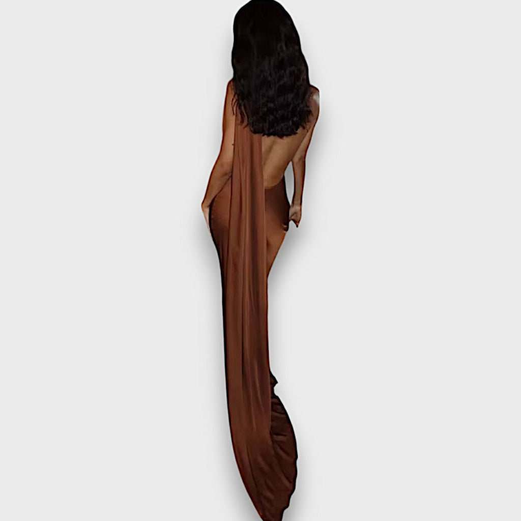 Corinne is the essence of modern evening elegance β featuring an off-the-shoulder cut that draws attention to the dΓ©colletage and a draped shawl that gently falls over the shoulder. The slim, body-hugging silhouette emphasizes the figure with understated sensuality, while the silky sheen of the fabric catches the light with every step. The flowing hem adds a theatrical touch to the look without being overpowering.