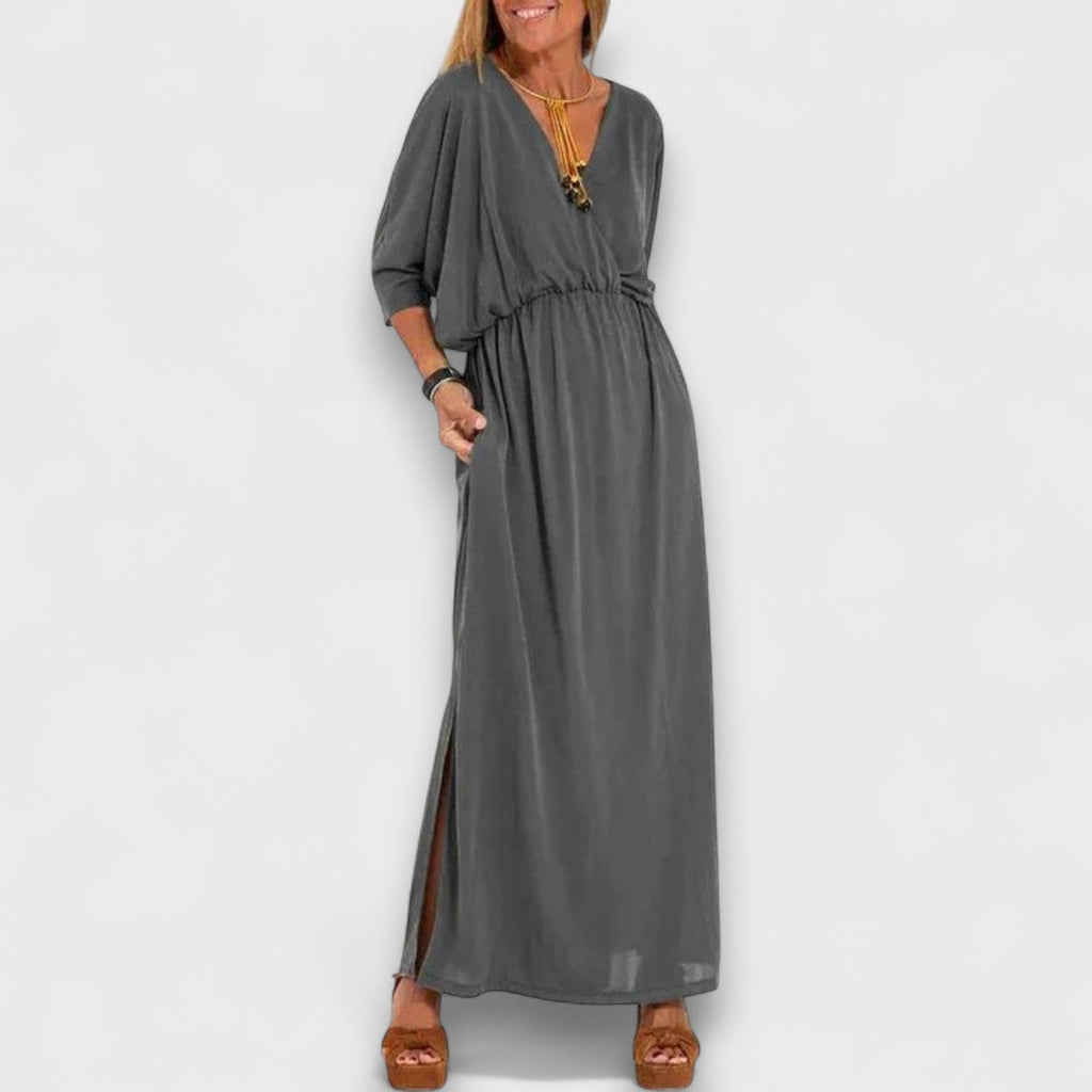 Elora dances around the figure in gentle lines – a dress that carries a touch of lightness through warm summer days. With its flattering cut, deep V-neckline, and subtle vintage flair, it brings feminine calm to every moment. The soft, breathable fabric caresses the skin and gives you a feeling of freedom that never compromises on elegance.