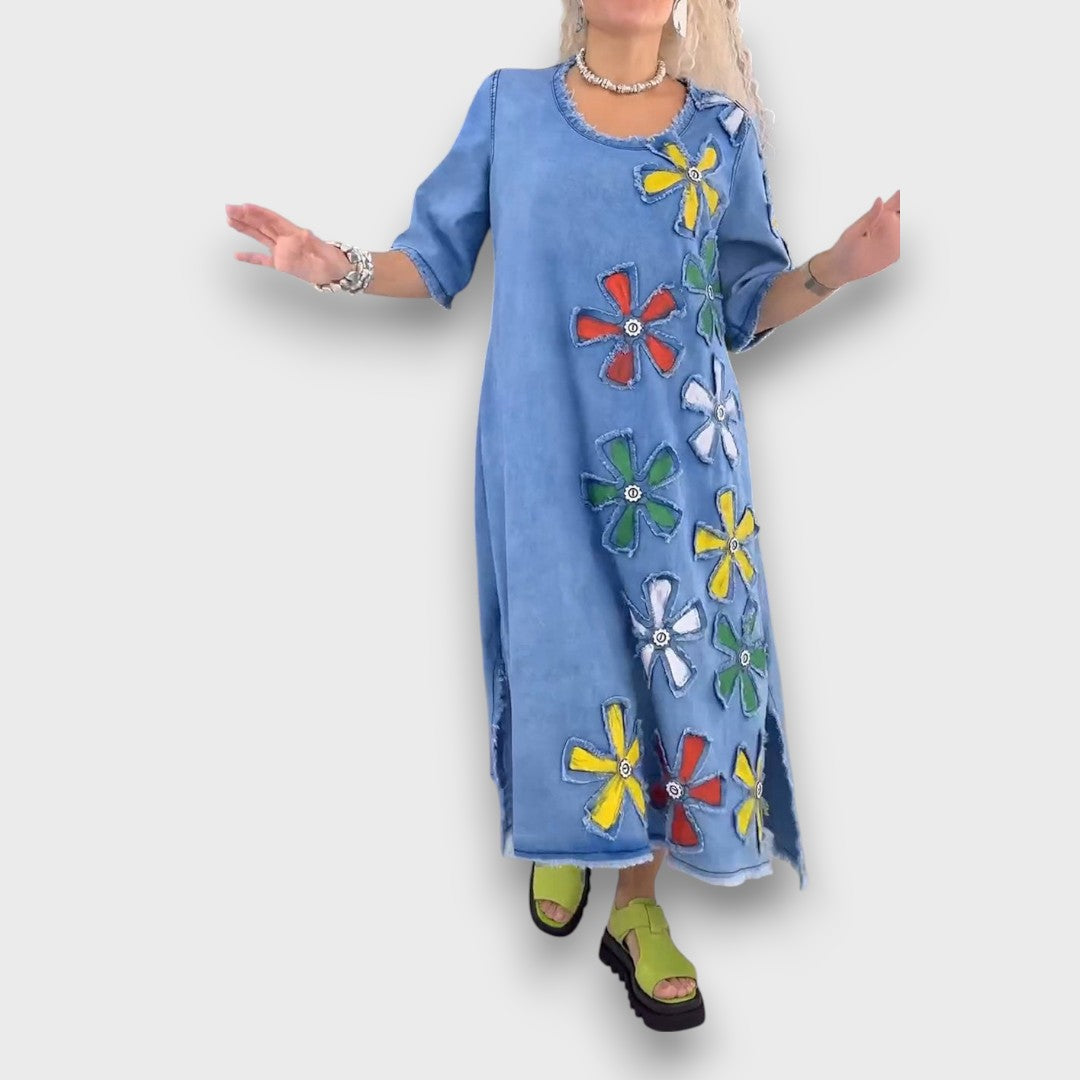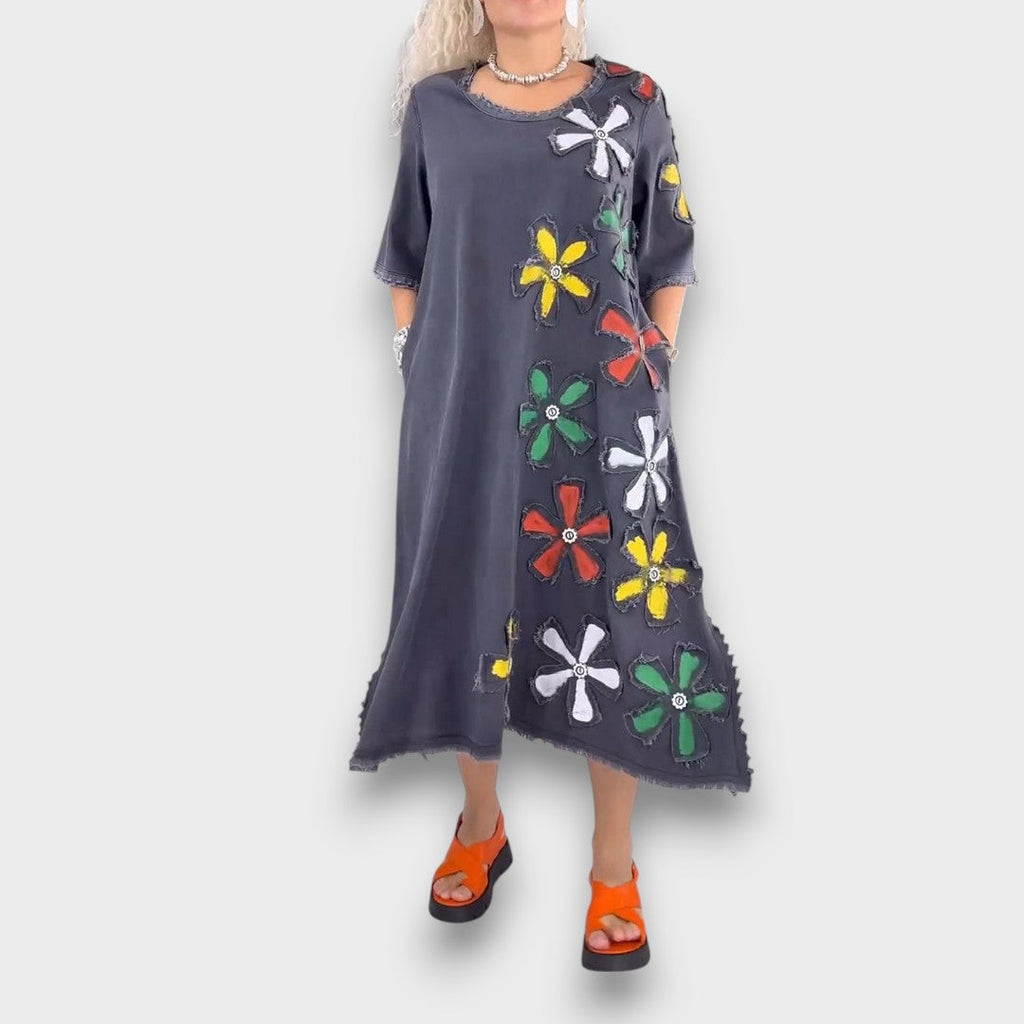 Luanda is a dress that carries good vibes. The asymmetrically placed flower appliquΓ©s in vibrant colors bring movement to the design and turn every gesture into a little statement. The loose, flowing cut flatters the figure and gives you a feeling of lightness β perfect for creative souls who want to combine comfort with character.