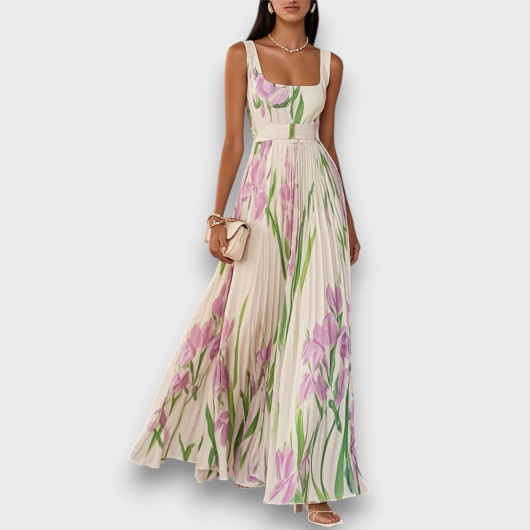 Nerelle dances with the light β a dress that breathes ease and accompanies every movement with gentle elegance. The square neckline brings structure, while the delicate pleats and the soft floral pattern in purple and green evoke a blooming summer meadow. The flowing shape emphasizes the waist and makes you appear effortlessly feminine β charming, sensual, free.