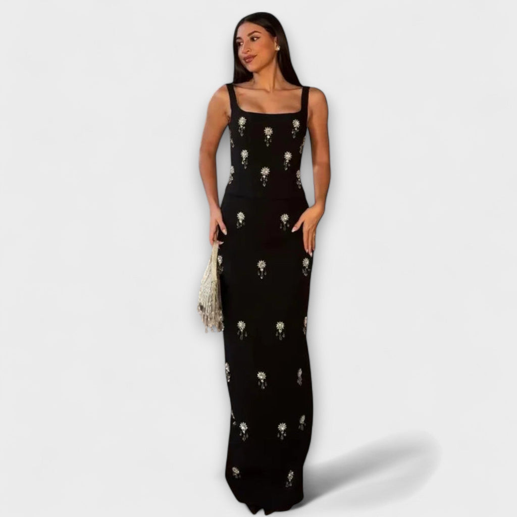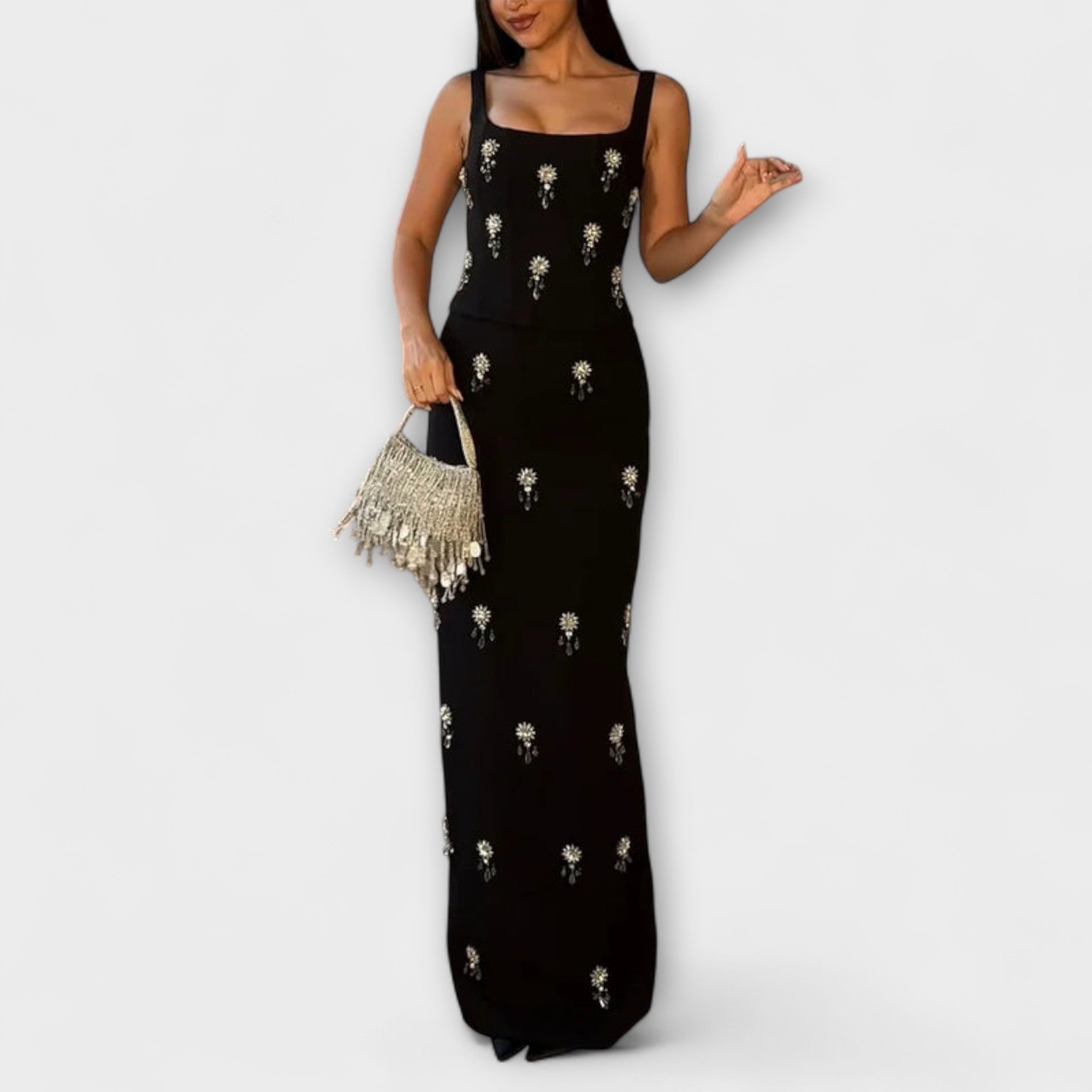 Aviane combines refined elegance with modern sophistication – a two-piece ensemble that stands out while remaining timeless. The pearl-embellished zipper top adds structure and shine, while the matching skirt impresses with its simple lines and feminine silhouette. A look for women who exude both class and strength.