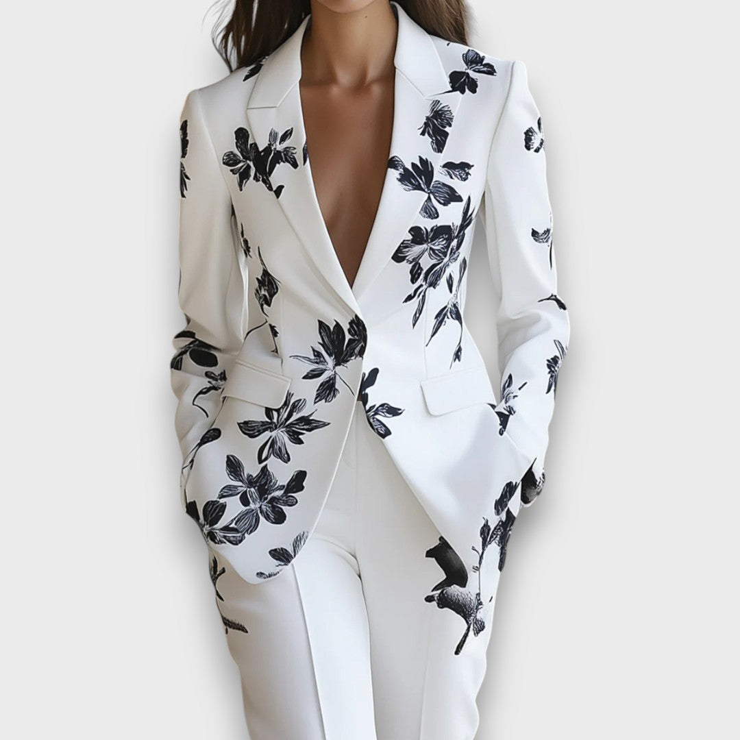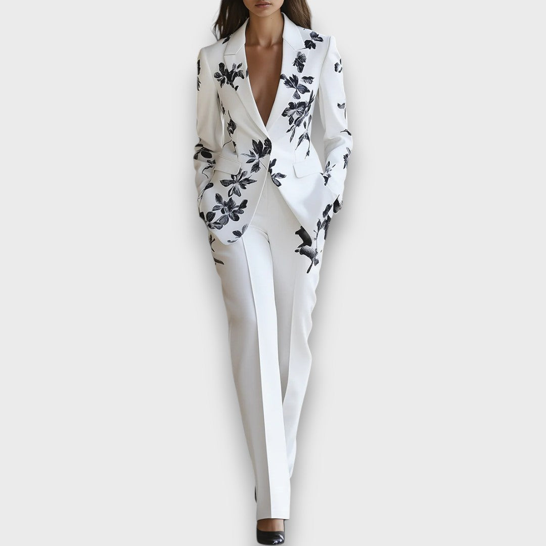Liravella combines simple elegance with expressive design. The white fabric offers clarity and refinement, while the black floral accents add depth and character to the ensemble. The tailored fit emphasizes the figure, complemented by straight-cut trousers that exude grace and strength. A pantsuit that perfectly balances modernity and timeless elegance.