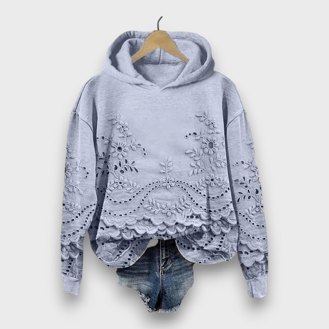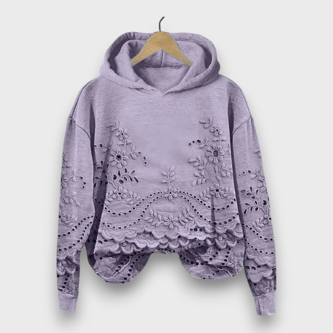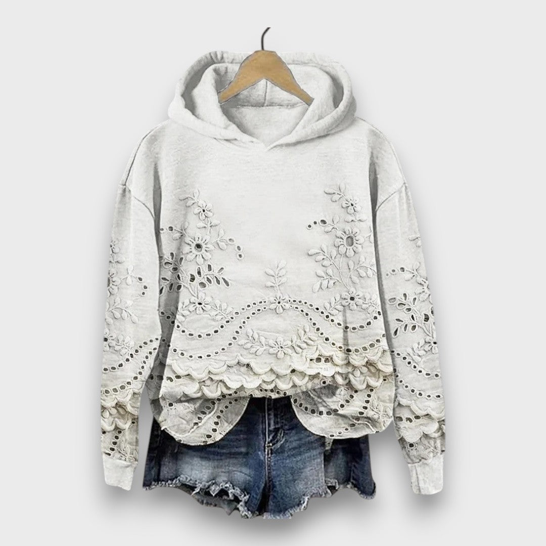 Romantic lace details β€” intricate floral embroidery and scalloped edges that elevate a simple hoodie into something uniquely feminine.