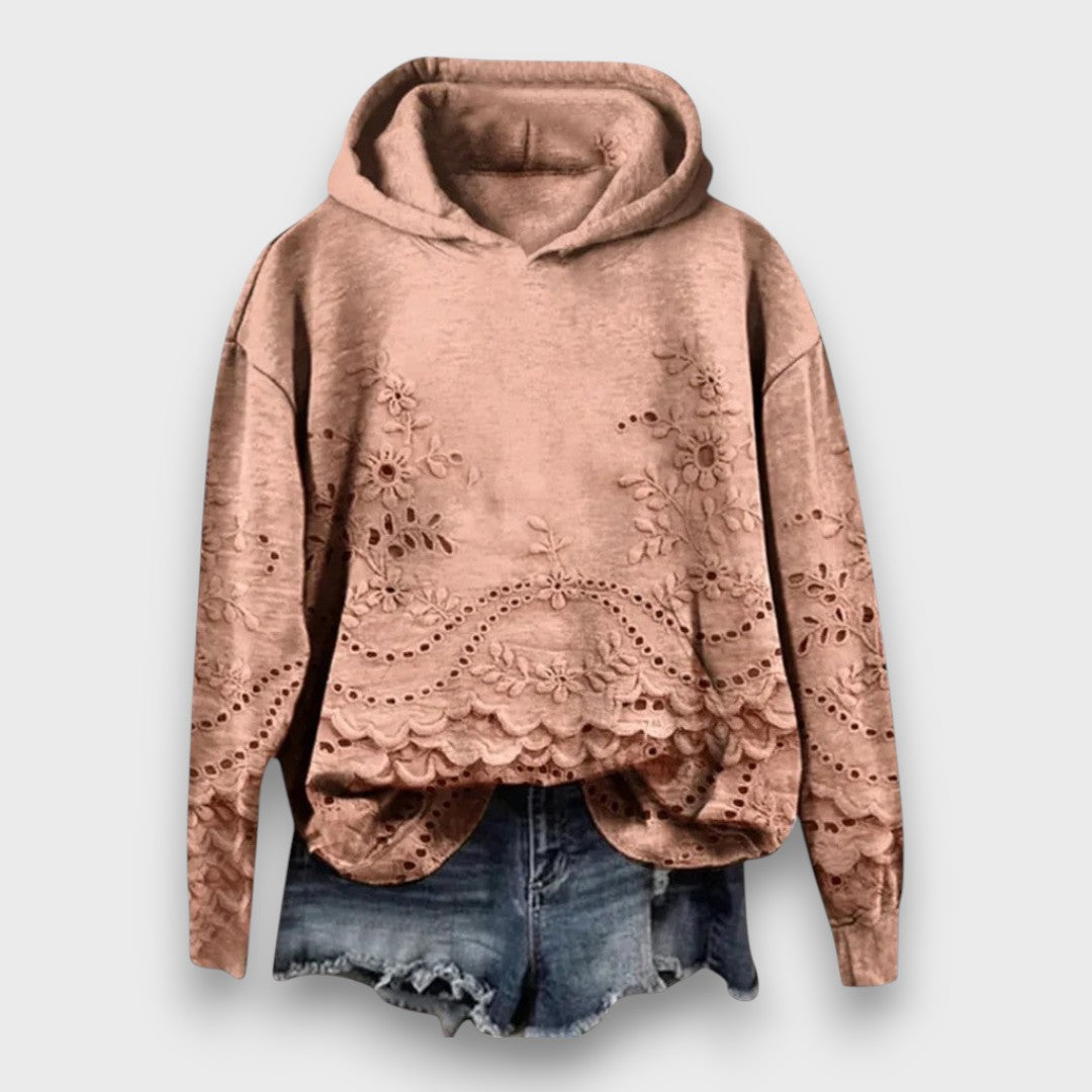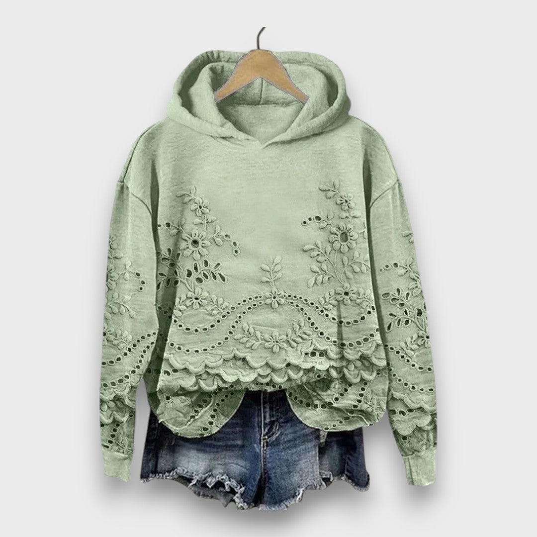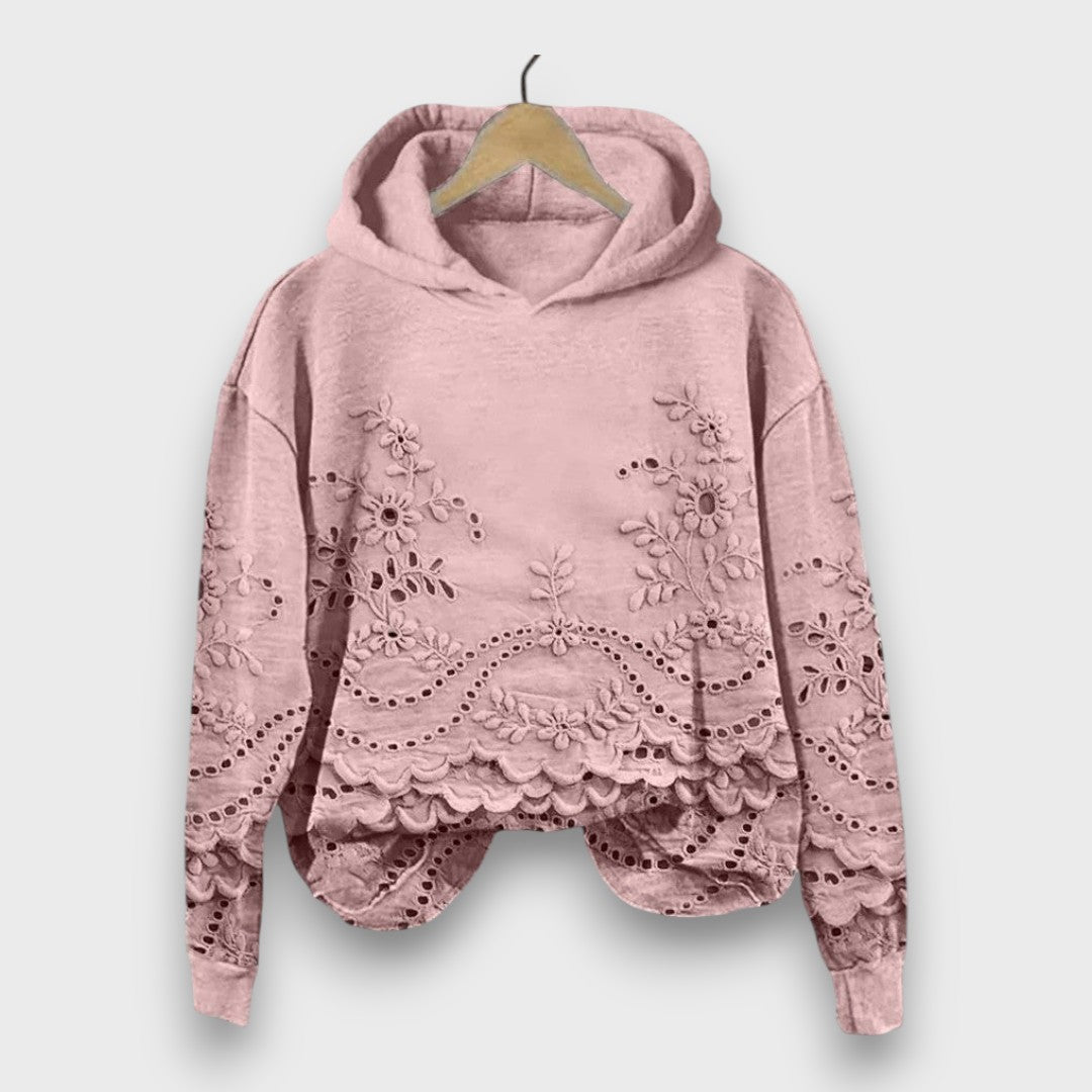 Romantic lace details β€” intricate floral embroidery and scalloped edges that elevate a simple hoodie into something uniquely feminine.