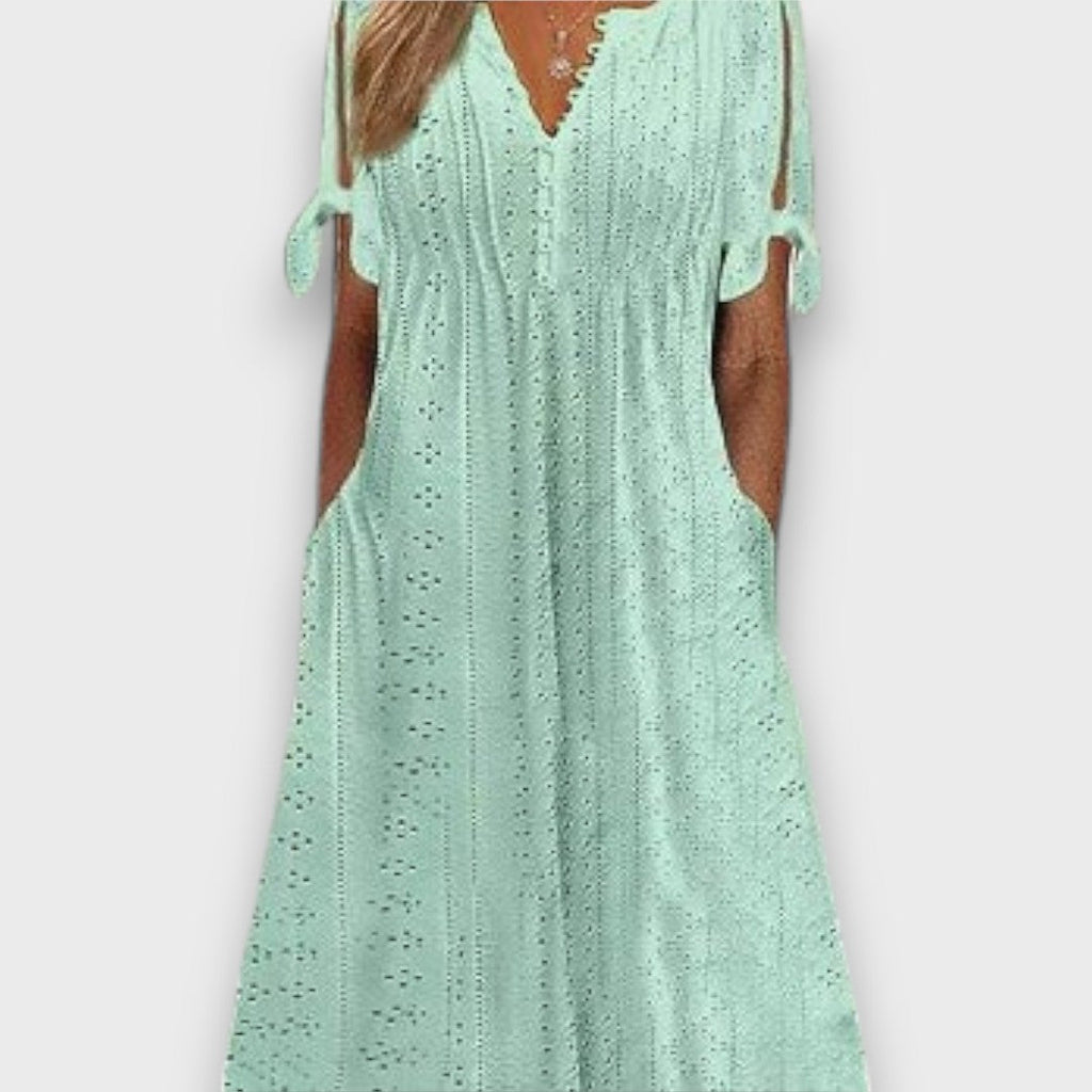Aureline is a touch of summer on the skin – with a breezy cut, delicate embroidery, and loving details. The V-neckline and the side ties at the sleeves give it lightness and a playful note, perfect for sunny days full of style and freedom.