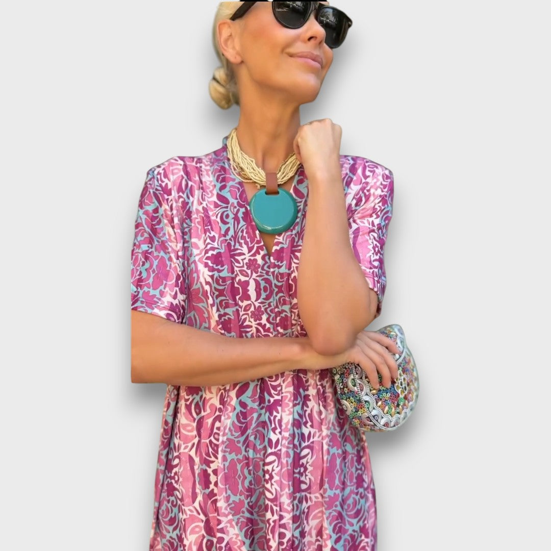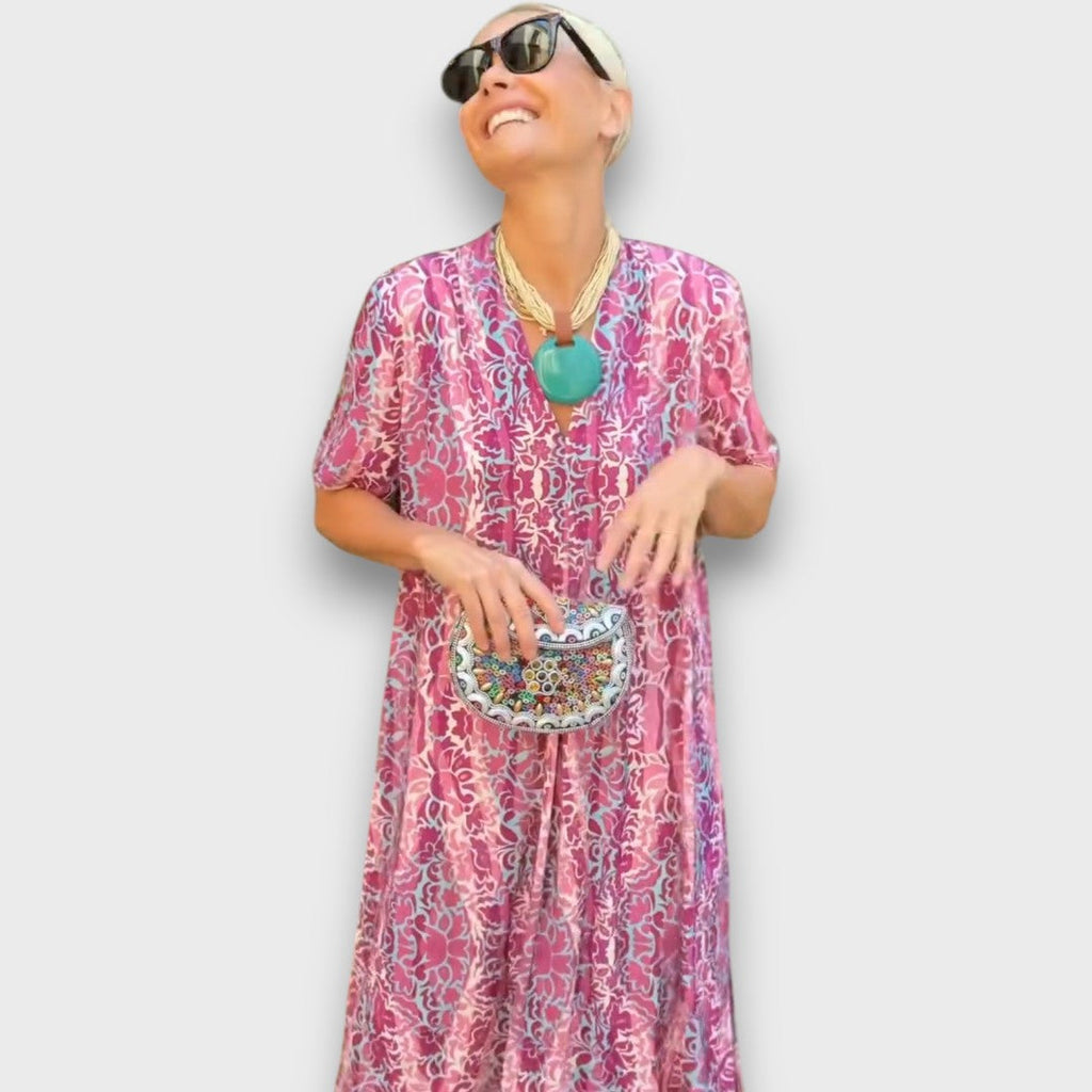 Ingrid brings joy and lightness to everyday life. The maxi dress in warm shades of pink plays with delicate patterns and ensures a relaxed, feminine appearance with its flowing silhouette. Whether strolling through the city or at a summer gathering with friends – Ingrid radiates natural elegance and carefree energy.