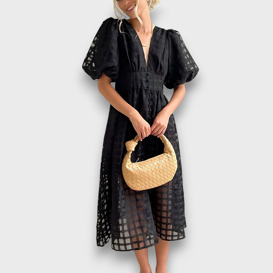 Lianora plays with light and lines – its semi-transparent fabric in a geometric grid design envelops you with ease and elegance. The fitted silhouette and flared midi length create a perfect balance between modern chic and romantic playfulness. Ideal for sunny occasions, garden parties, or stylish evenings outdoors.