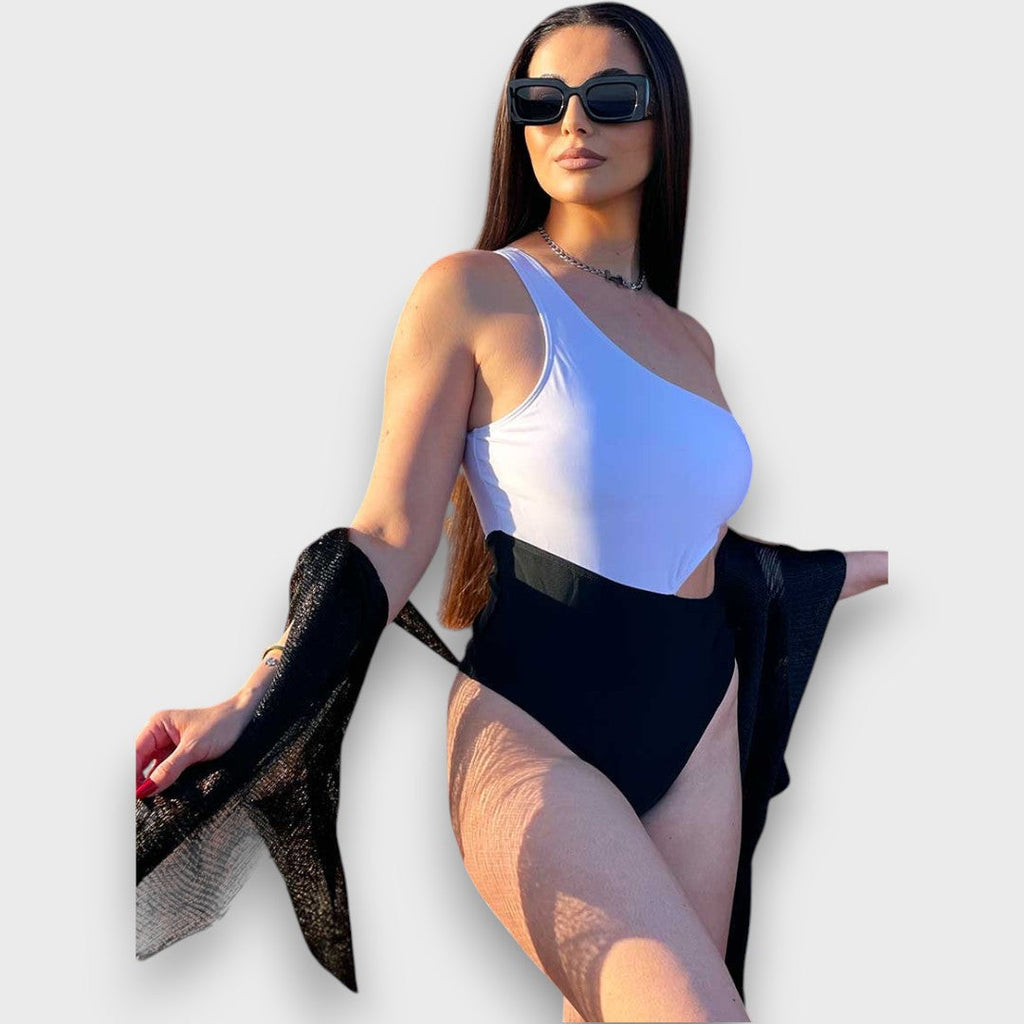 Lior is a swimsuit that combines bold shaping with clear elegance. The one-shoulder design and contrasting color blocking give it a sculptural presence, while the cut-out at the waist and the delicate chain embellishment accentuate the silhouette in a feminine way. A look that is more than just beachwear β itβs a style statement.