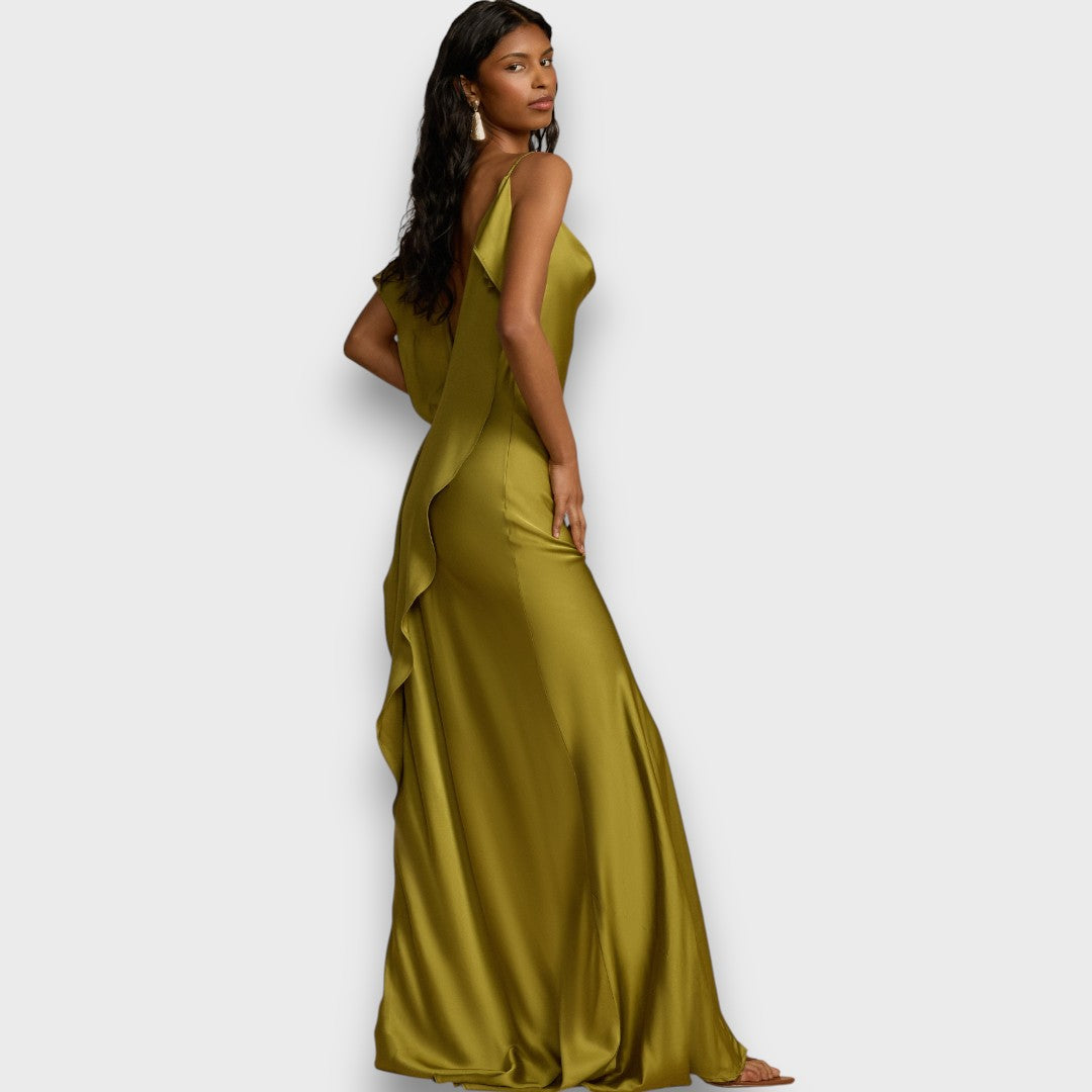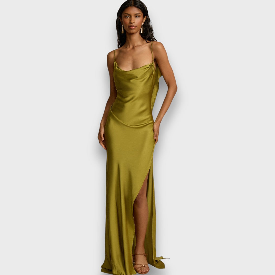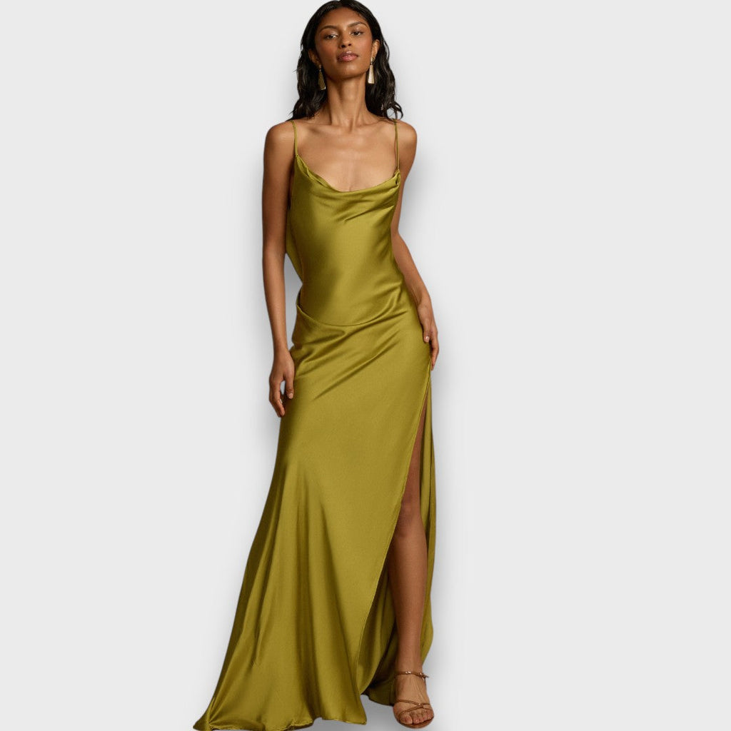 Wilisse is a dress designed to be the center of attention. The flowing pistachio tone wraps around the figure like liquid light – feminine, sensual, powerful. The soft waterfall neckline and delicate spaghetti straps provide a subtle balance, while the high leg slit adds bold elegance to the look. The deep back cut with flowing draping completes the effect with a touch of sculpturality.