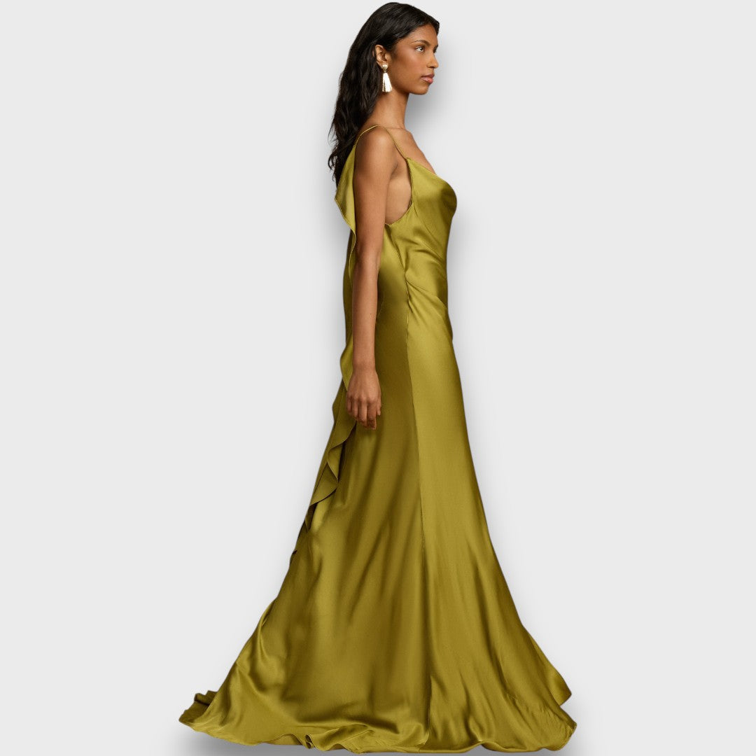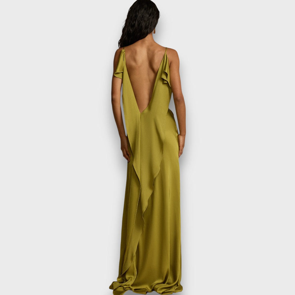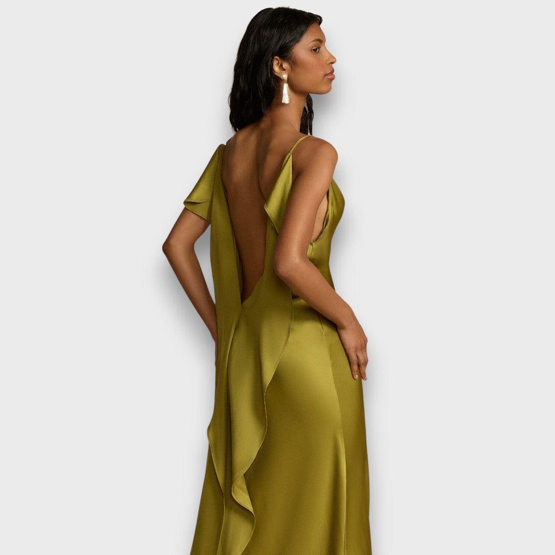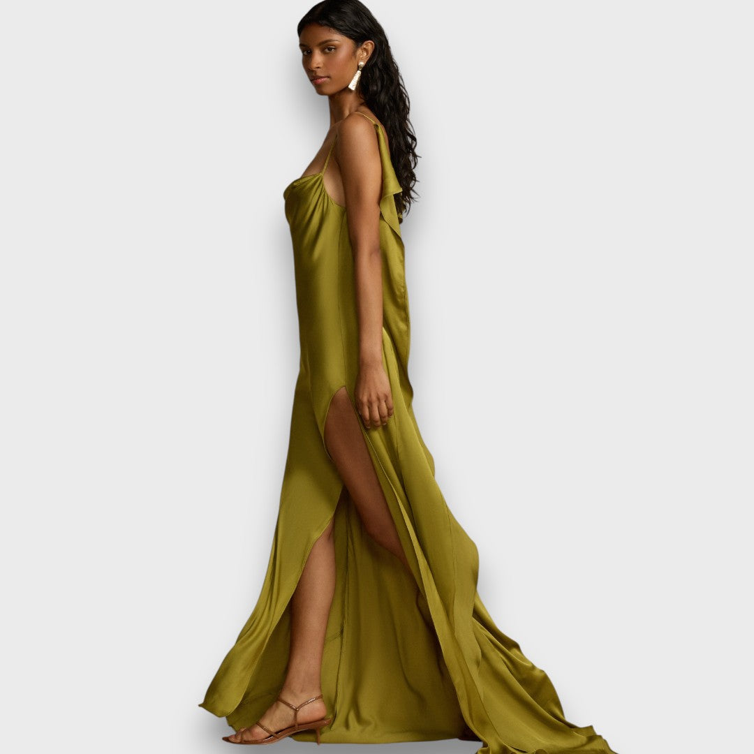 Wilisse is a dress designed to be the center of attention. The flowing pistachio tone wraps around the figure like liquid light – feminine, sensual, powerful. The soft waterfall neckline and delicate spaghetti straps provide a subtle balance, while the high leg slit adds bold elegance to the look. The deep back cut with flowing draping completes the effect with a touch of sculpturality.