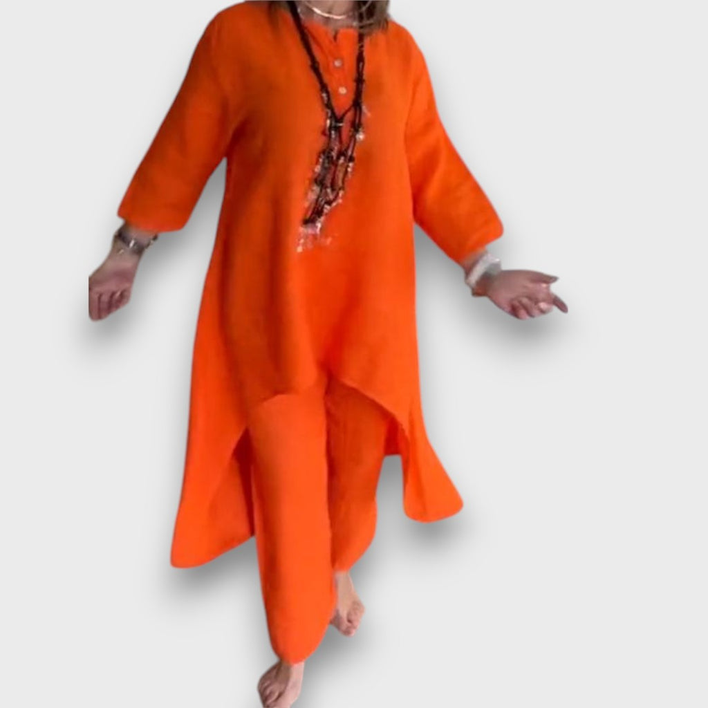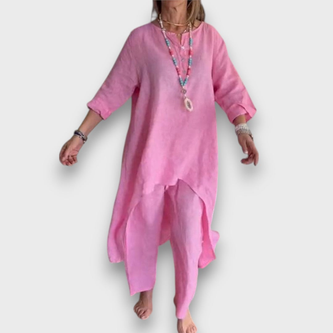 Carenza embodies airy elegance with a touch of Mediterranean lightness. The flowing top with a slightly extended hem meets a loosely cut pair of pants – together they create an ensemble that combines comfort with style. Ideal for relaxed days by the sea, garden parties, or elegant everyday moments.