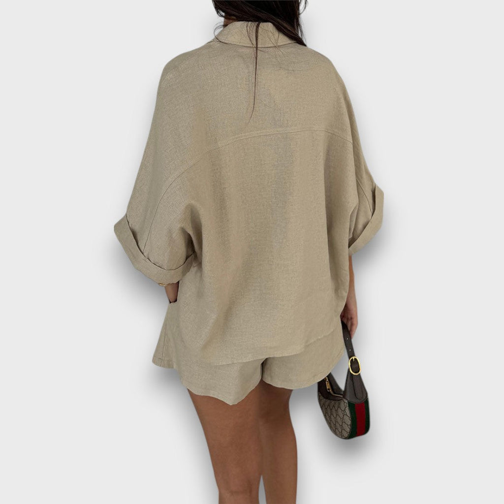 Salvia is a statement of modern elegance in its most relaxed form. The wide-cut short-sleeve blouse meets structured shorts with fine pleats β together they create a look that appears effortlessly stylish, whether out in the city or enjoying a relaxed lunch on the terrace.