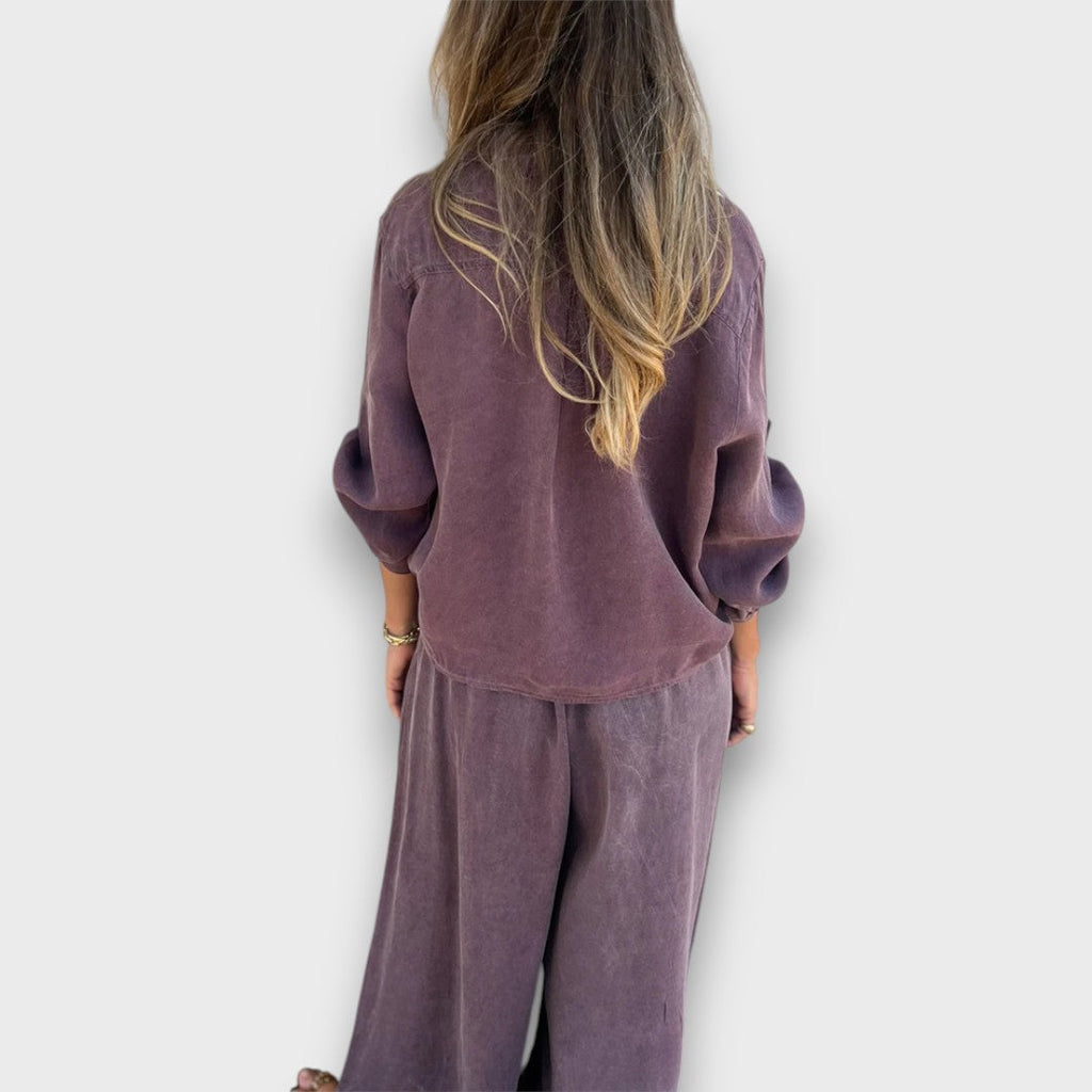 Soren is the definition of relaxed style. The loosely cut shirt with a chest pocket and knot detail pairs with wide-leg pants that allow for freedom of movement. A look that radiates tranquility – perfect for vacation days, quiet afternoons, or strolls through the city. For women who love comfort while staying true to themselves.