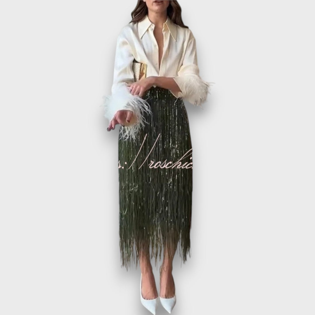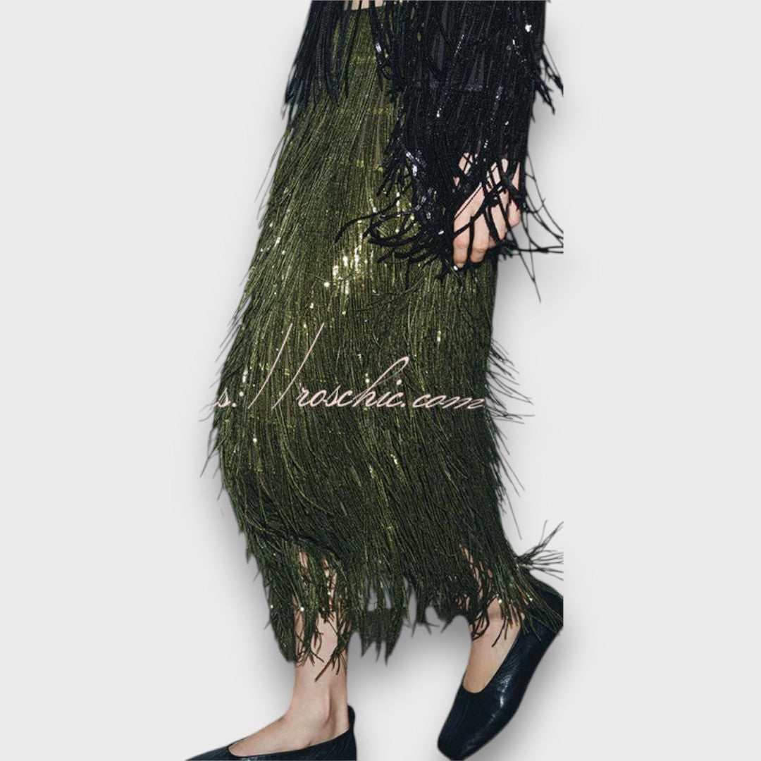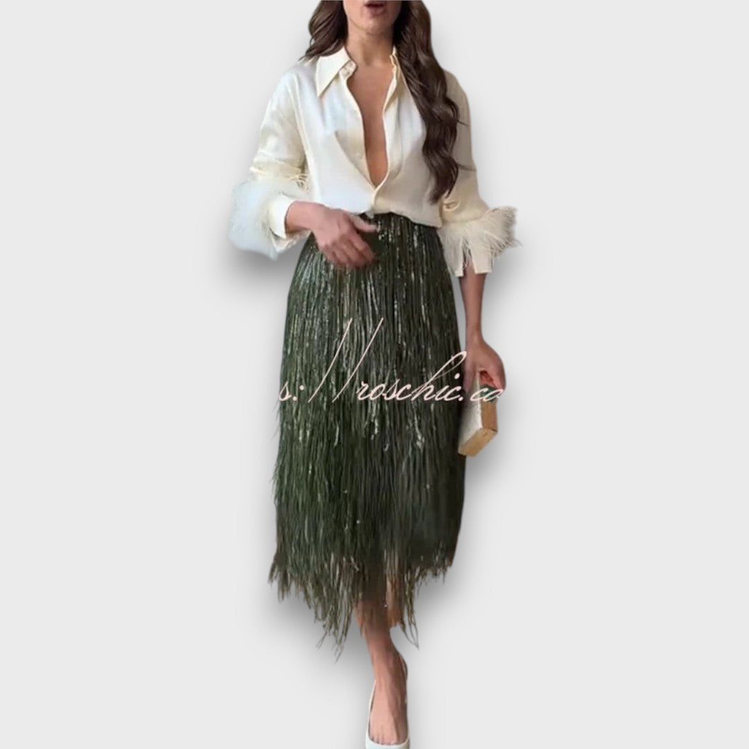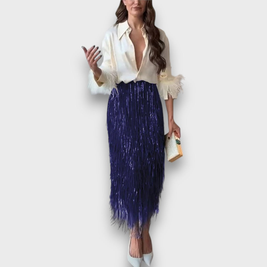 Serena brings a refined yet playful elegance to your wardrobe β a shimmering midi skirt that moves with effortless grace. The layered tassel design catches the light with every step, offering texture, depth, and a touch of drama. Its high-rise silhouette smooths the waist beautifully, while the back zipper keeps the look sleek and structured. Itβs the kind of skirt you reach for when you want to feel elevated, confident, and effortlessly glamorous β from dinner nights to festive celebrations.