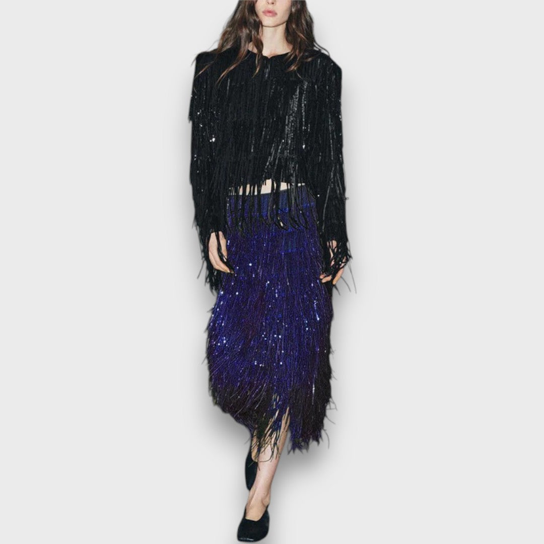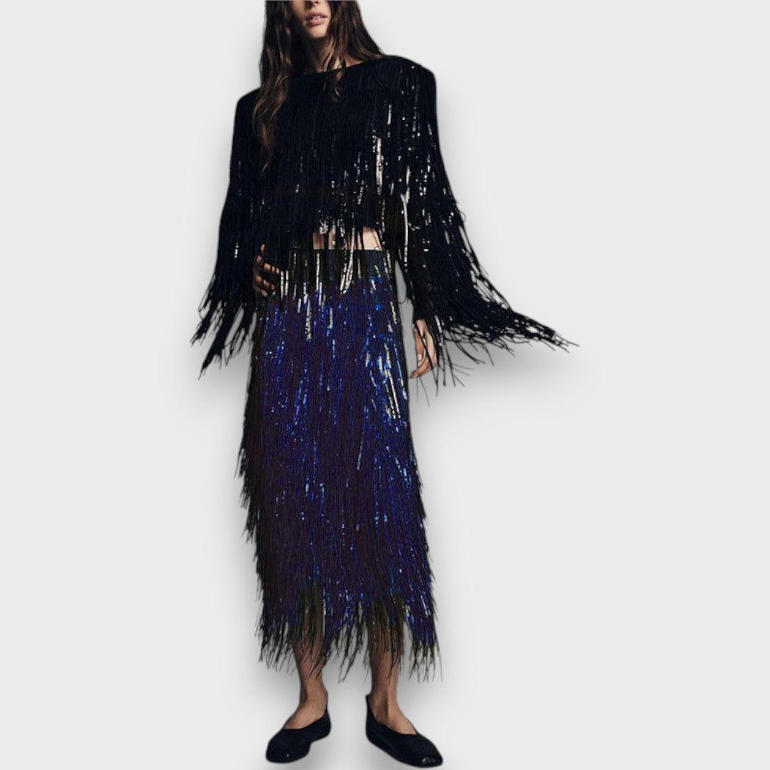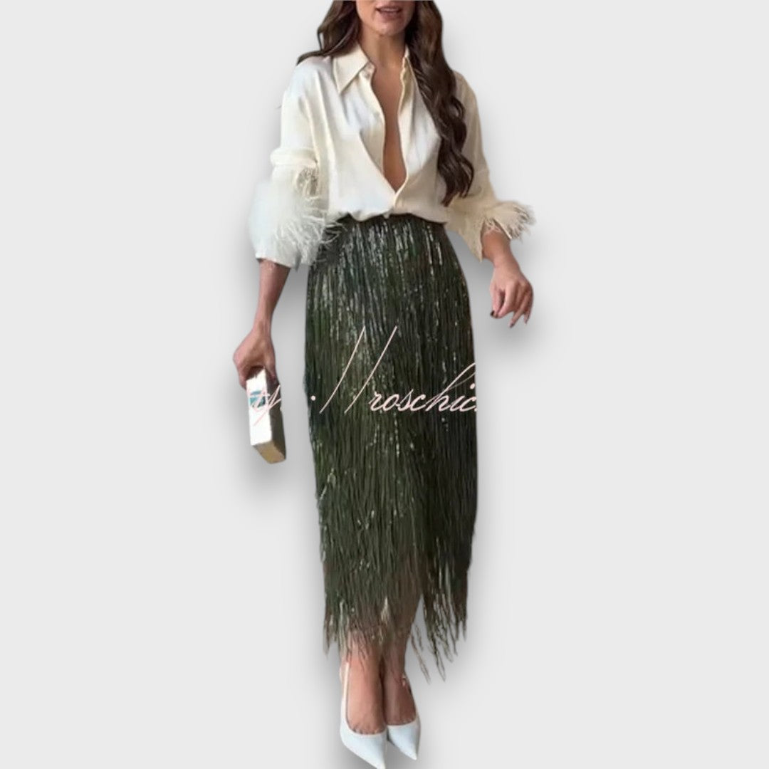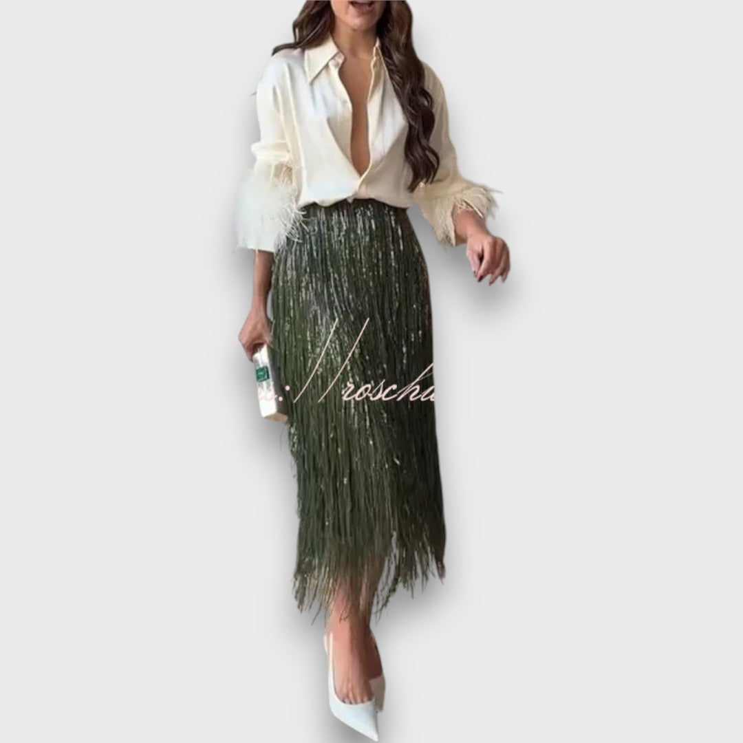 Serena brings a refined yet playful elegance to your wardrobe β a shimmering midi skirt that moves with effortless grace. The layered tassel design catches the light with every step, offering texture, depth, and a touch of drama. Its high-rise silhouette smooths the waist beautifully, while the back zipper keeps the look sleek and structured. Itβs the kind of skirt you reach for when you want to feel elevated, confident, and effortlessly glamorous β from dinner nights to festive celebrations.