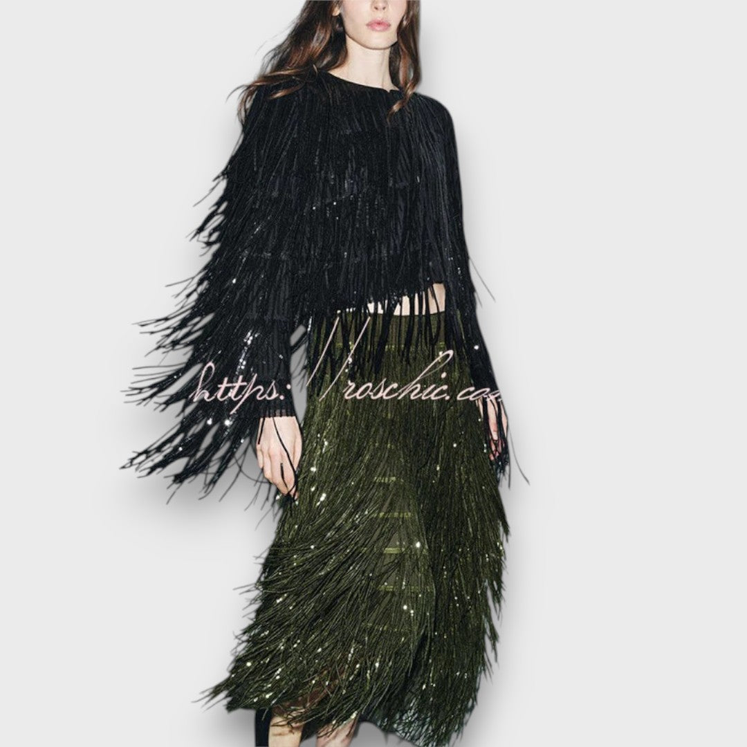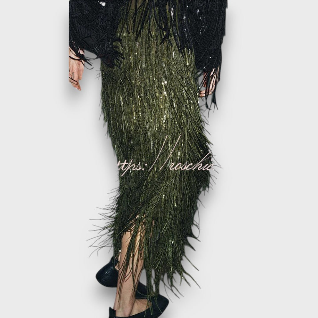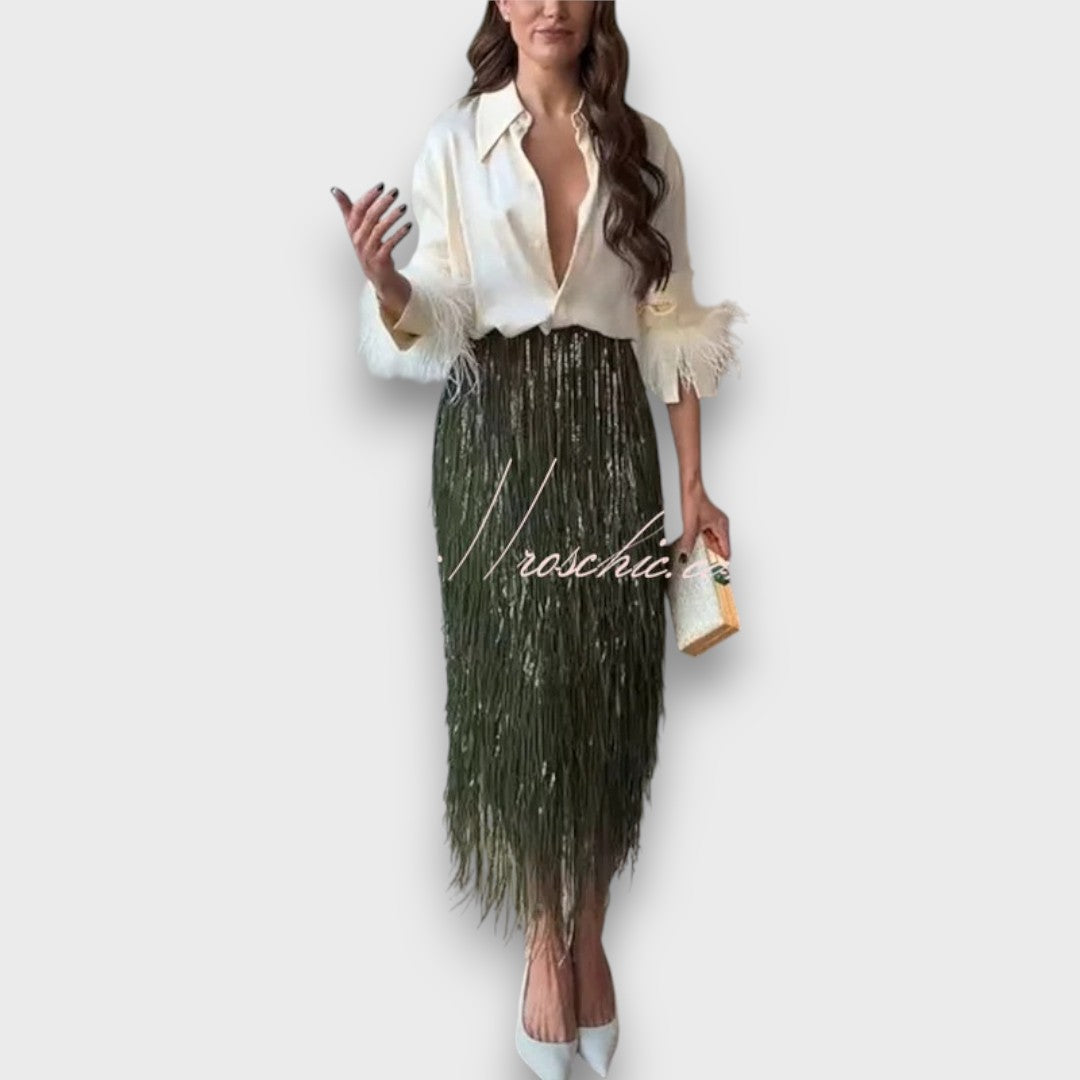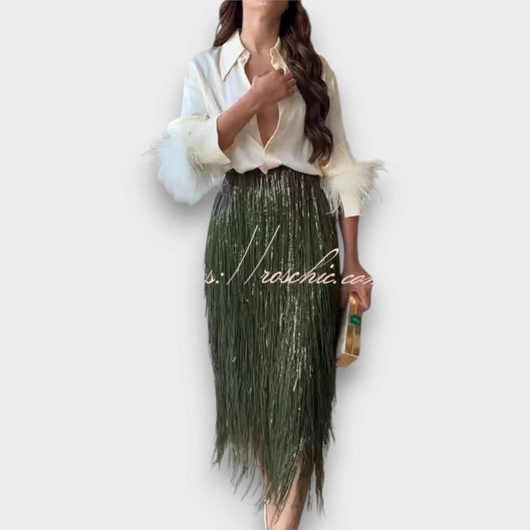 Serena brings a refined yet playful elegance to your wardrobe β a shimmering midi skirt that moves with effortless grace. The layered tassel design catches the light with every step, offering texture, depth, and a touch of drama. Its high-rise silhouette smooths the waist beautifully, while the back zipper keeps the look sleek and structured. Itβs the kind of skirt you reach for when you want to feel elevated, confident, and effortlessly glamorous β from dinner nights to festive celebrations.