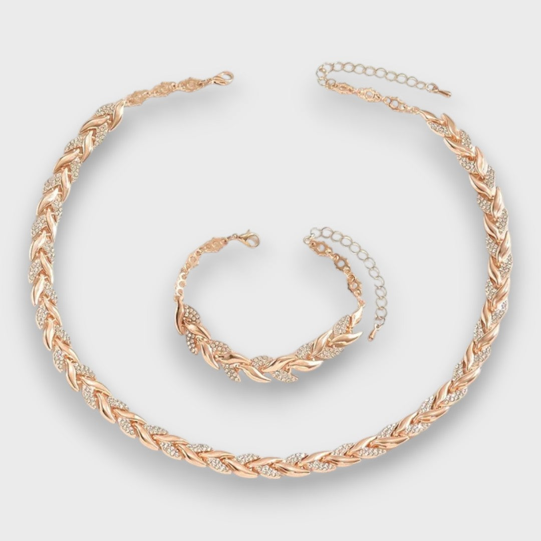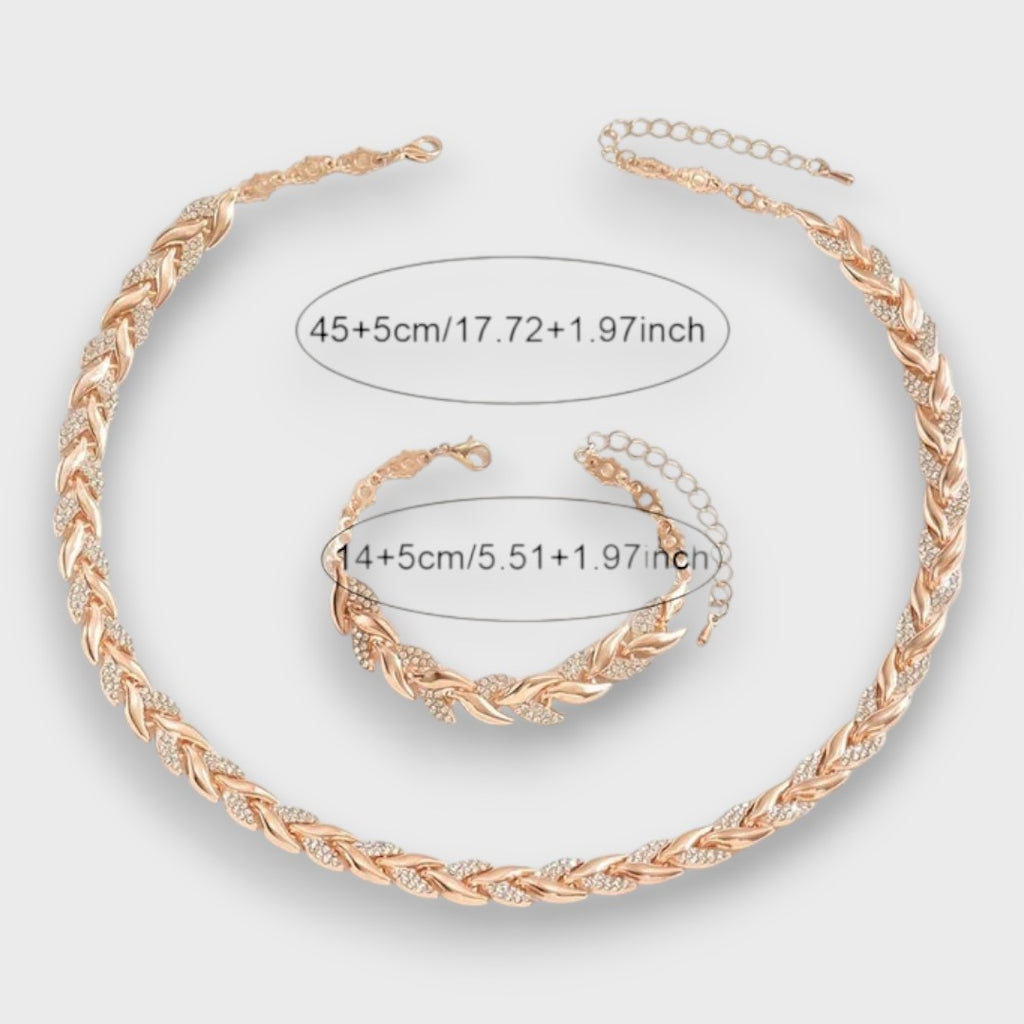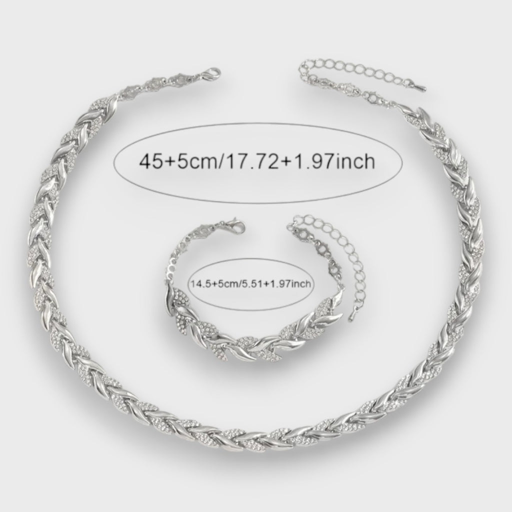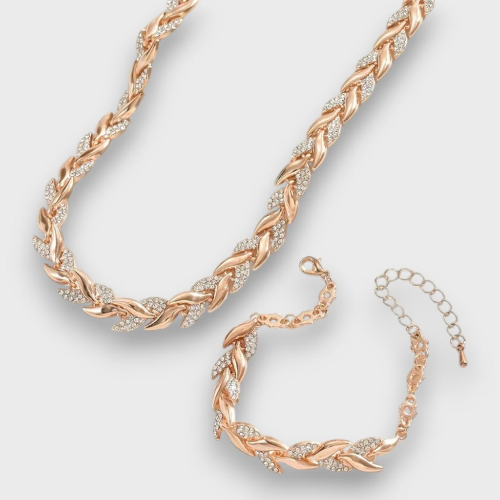 Elaria brings a soft, luminous radiance to every look — a beautifully sculpted necklace-and-bracelet duo inspired by the fluid curves of a fishtail silhouette. Each link catches the light with delicate precision, blending warm metallic tones and sparkling rhinestones to create a glowing, effortless sophistication. Whether worn together for a polished statement or separately for a subtle hint of shine, it’s the kind of set that turns even simple outfits into something refined and memorable.