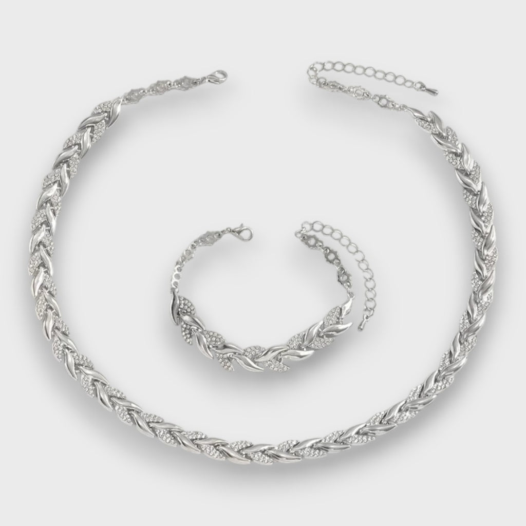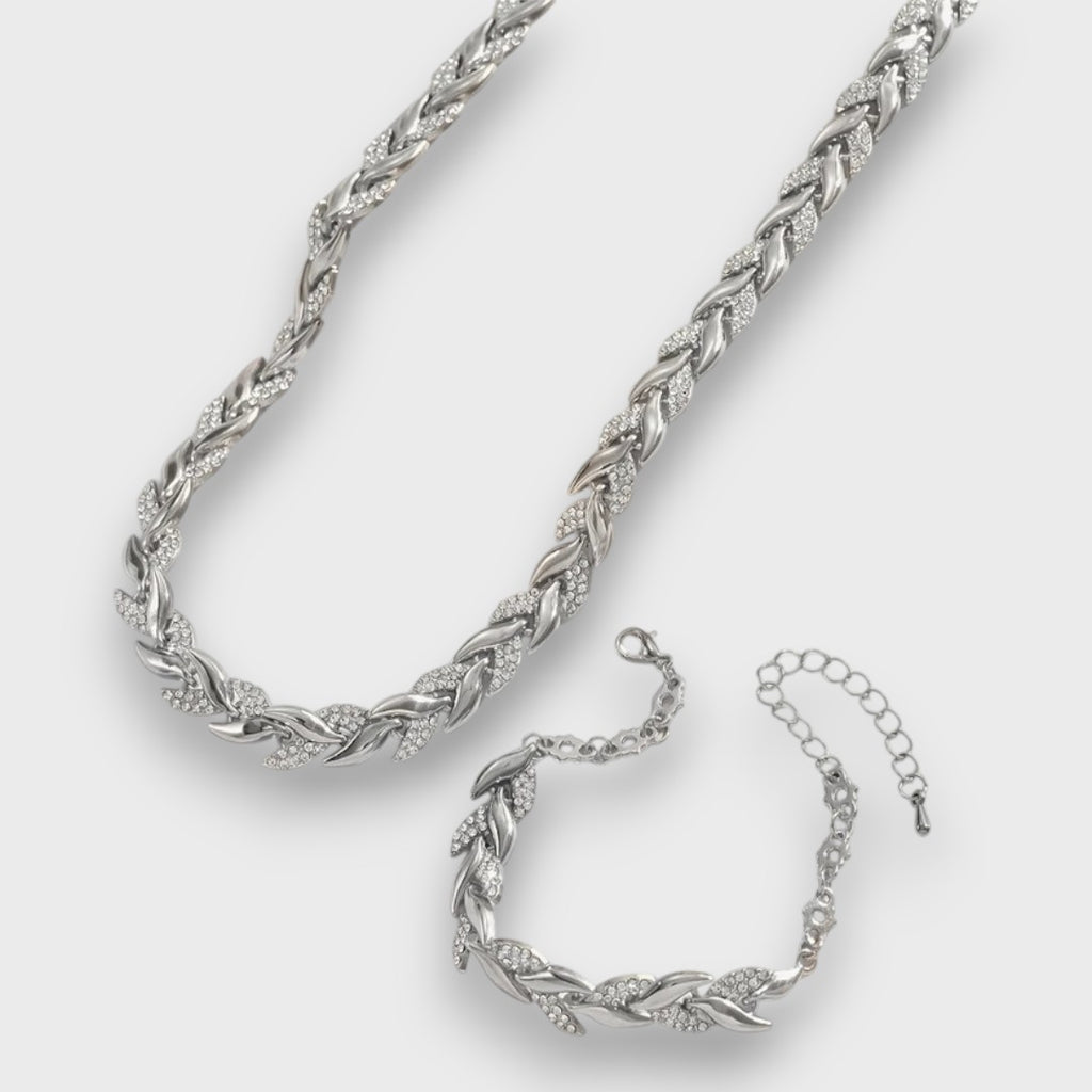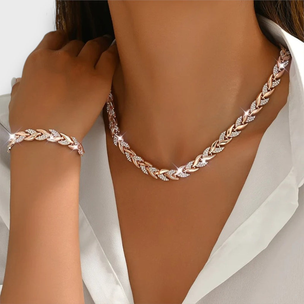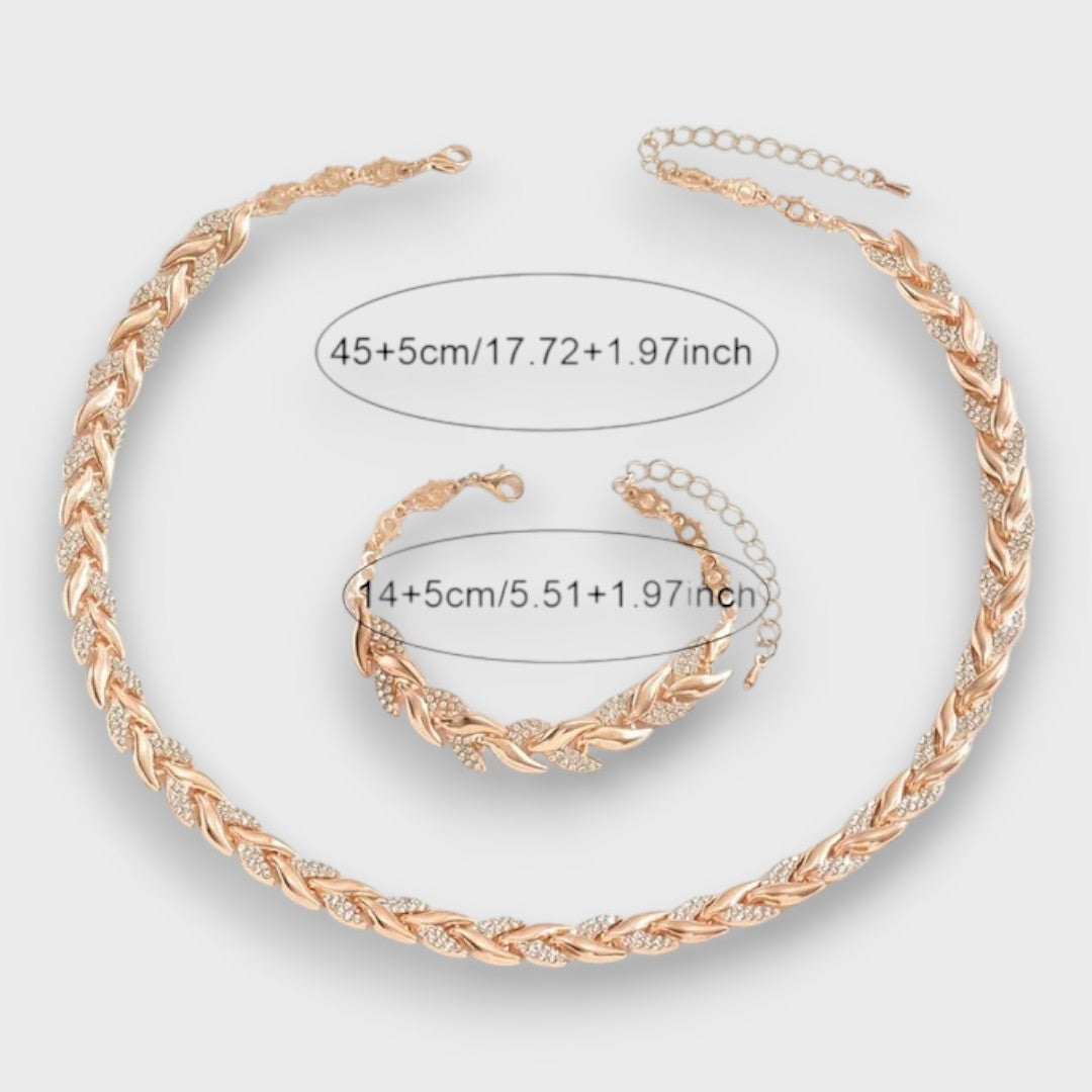 Elaria brings a soft, luminous radiance to every look — a beautifully sculpted necklace-and-bracelet duo inspired by the fluid curves of a fishtail silhouette. Each link catches the light with delicate precision, blending warm metallic tones and sparkling rhinestones to create a glowing, effortless sophistication. Whether worn together for a polished statement or separately for a subtle hint of shine, it’s the kind of set that turns even simple outfits into something refined and memorable.