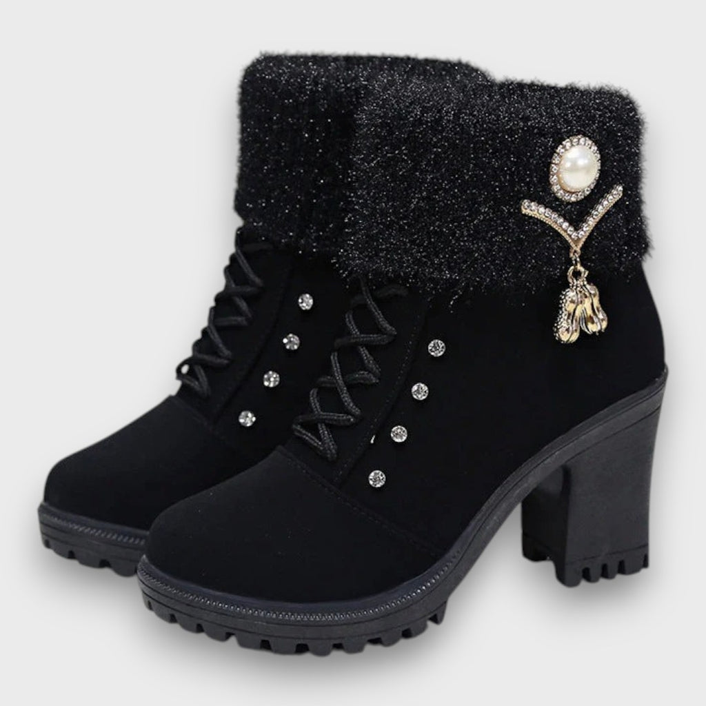 Evarine brings a touch of charm to cold-weather dressing β a pair of winter boots where warmth meets a hint of glamour. The soft knit cuff wraps the ankle in cozy comfort, while the pearl and crystal accents add a refined sparkle that instantly elevates your look. With a sturdy block heel and a rugged treaded sole, they offer balance, stability, and a confident stride through chilly days, festive outings, and evening plans where you still want to feel beautifully put together.