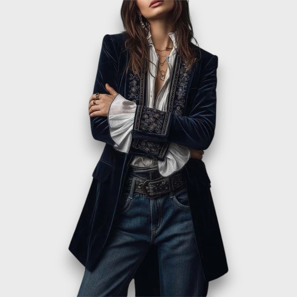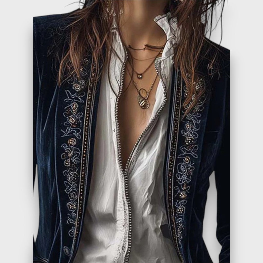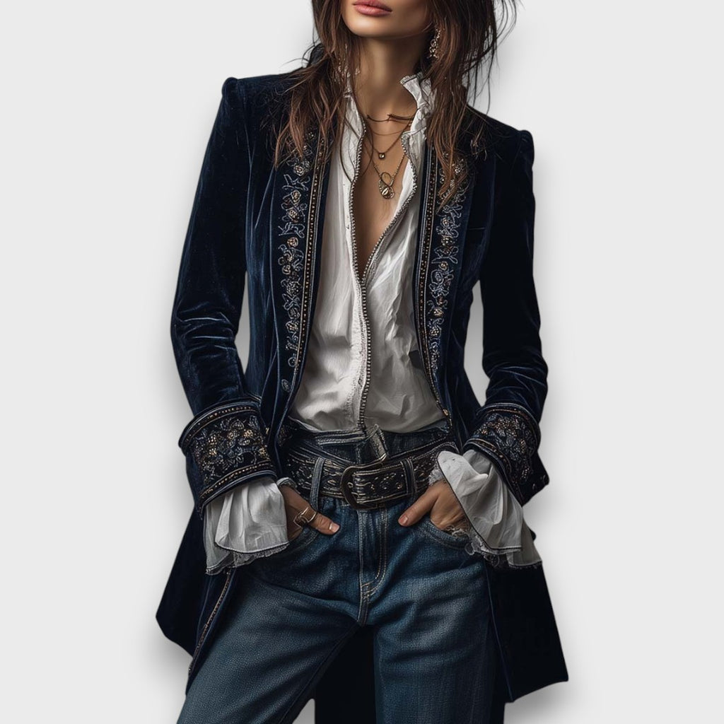 Karielle brings a refined, artistic edge to modern dressing β a velvet jacket that feels luxurious without ever trying too hard. Its rich, deep finish sets the stage for intricate embroidery along the lapels and cuffs, adding quiet opulence to a silhouette thatβs both tailored and effortlessly relaxed. Soft to the touch yet structured in all the right places, it elevates denim, dresses, and every in-between moment with a feeling of confident sophistication.