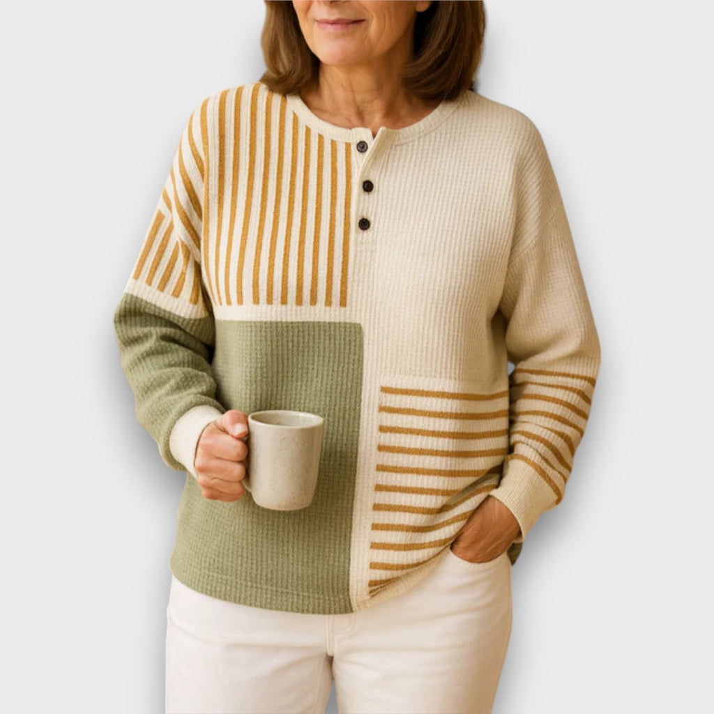 Lirene blends softness with quiet structure in a top that feels as comforting as it looks modern. The geometric patchwork adds a touch of artistic edge, while the double-layer waffle knit with its brushed interior wraps you in warmth without feeling heavy. Its relaxed silhouette drapes effortlessly, moving with you through slow mornings, cozy afternoons, and every moment where comfort meets intention.