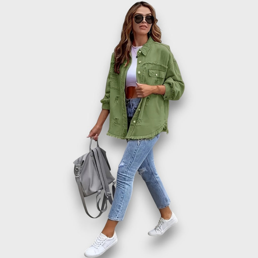 Neraya blends bold charm with casual ease. Its structured shape softened by a frayed hem creates the perfect balance of polish and playfulness. Worn open over a crop top or buttoned for a sharper edge, this overshirt shifts effortlessly from a weekend stroll to a casual night out. A piece that makes even the simplest outfit feel styled and complete.