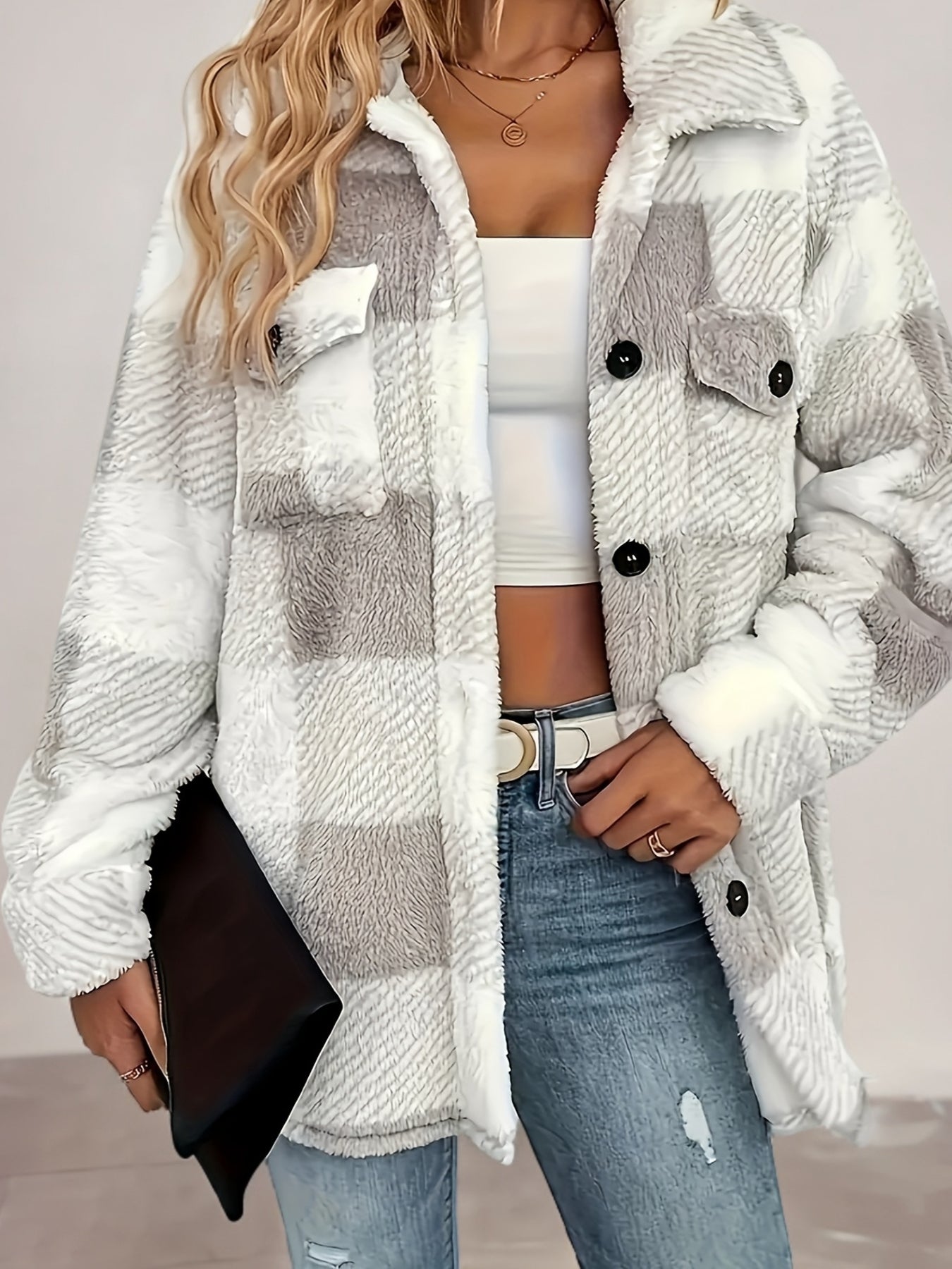 Women's Plush Fleece Winter Jacket - Yellow & White Checkered High Elasticity Coat, Machine Washable Middle Eastern-Inspired Elegance Collection for Fall & Winter